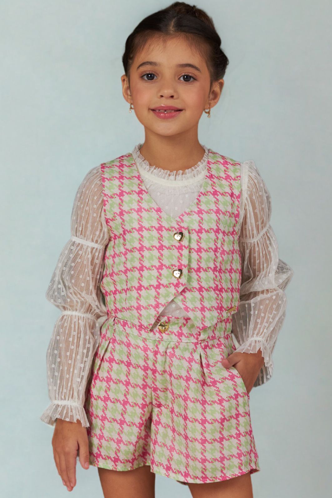Descrição | A blusa possui babado embutido no decote, com fita aplicada sobre o babado. As mangas têm elásticos aplicados próximos às cavas, no centro e nos punhos. A peça conta ainda com abertura nas costas, com fechamento por meio de fita para amarração. |