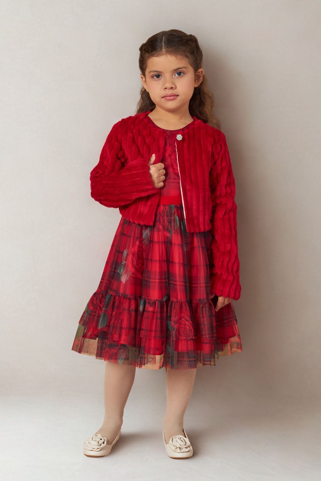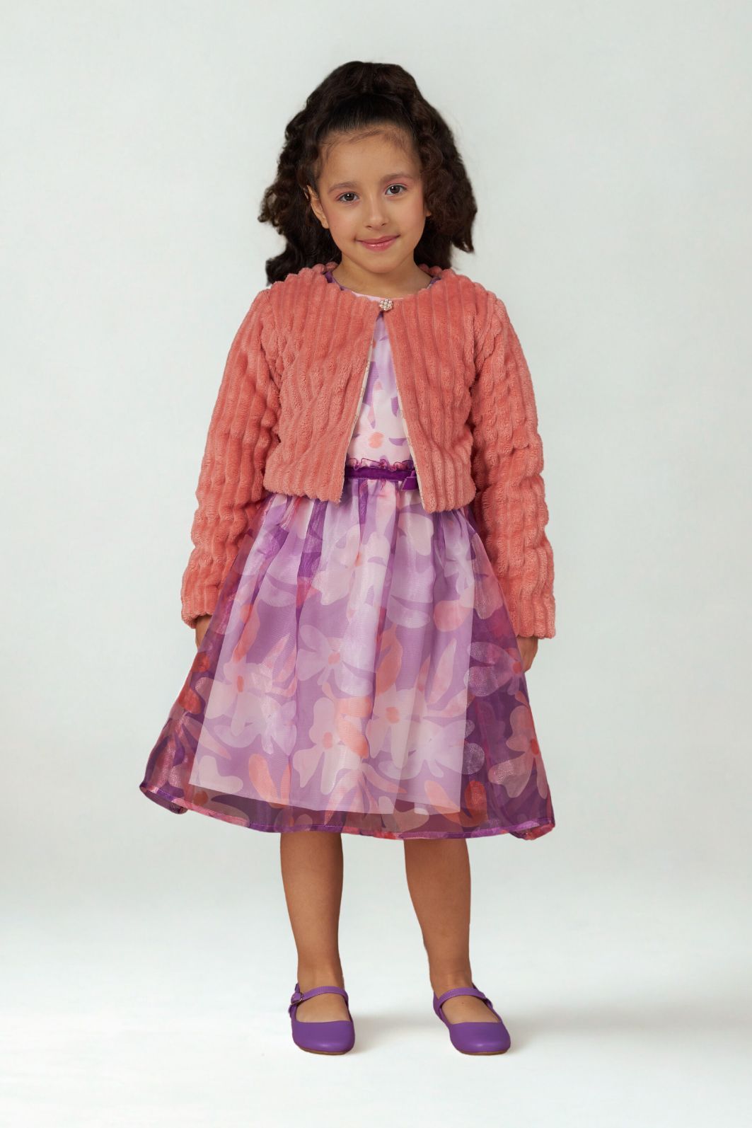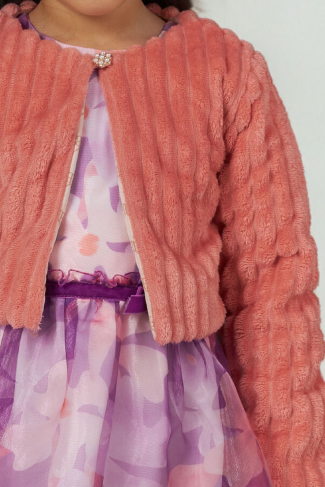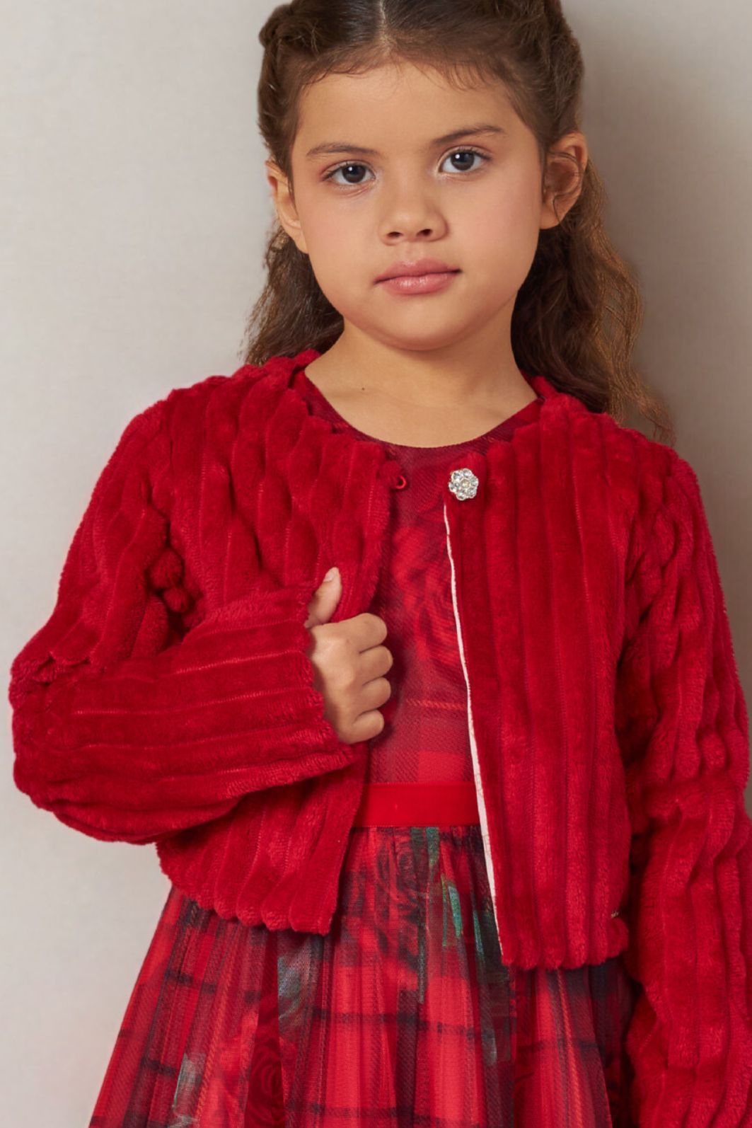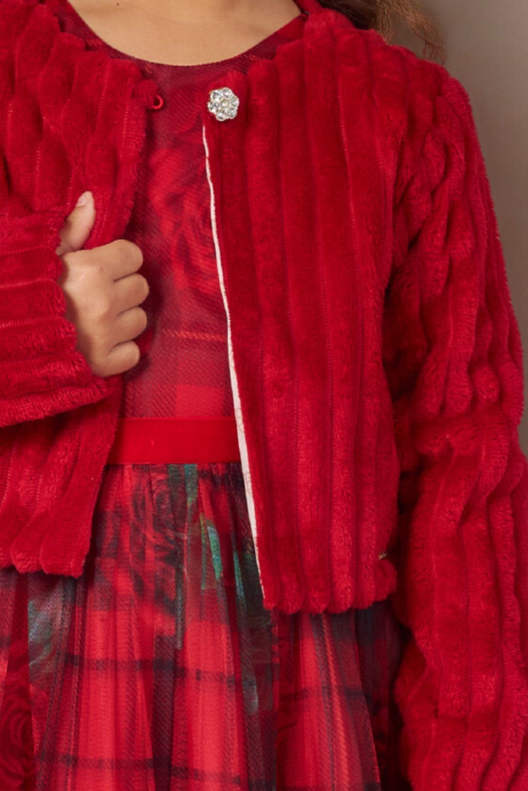 Descrição | "O bolero possui decote embutido ao forro, com elástico e botão aplicados para fechamento. As mangas são tradicionais, e a peça conta com placa personalizada da marca aplicada na parte inferior frontal. " |