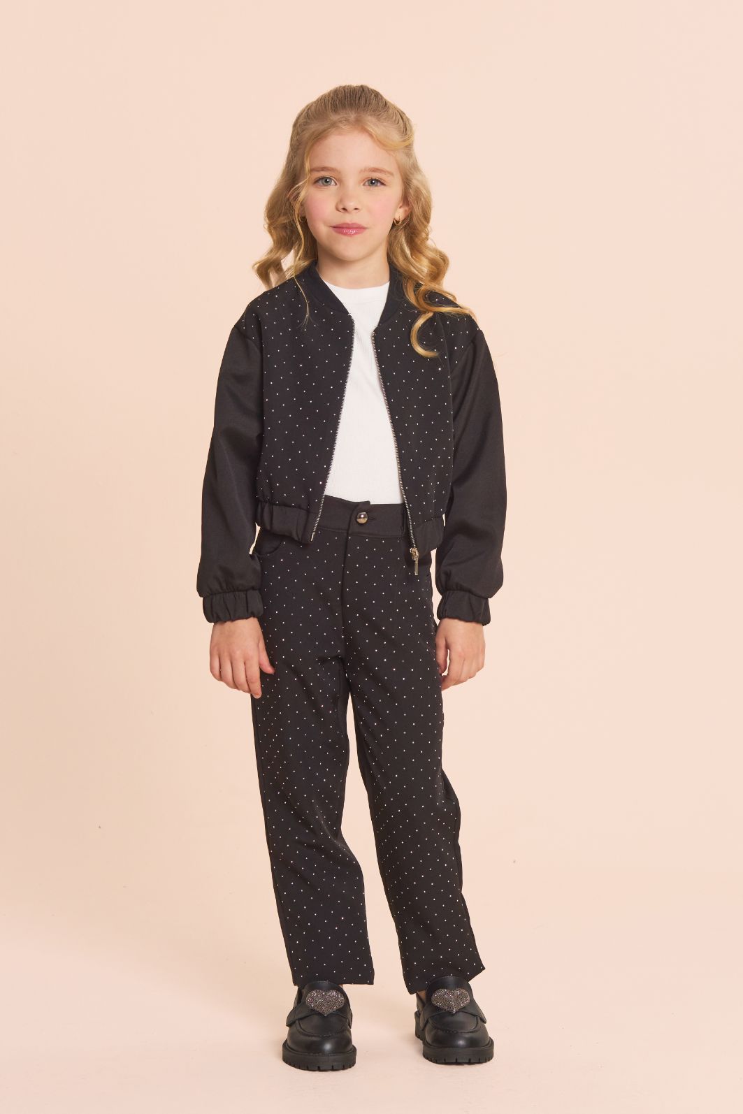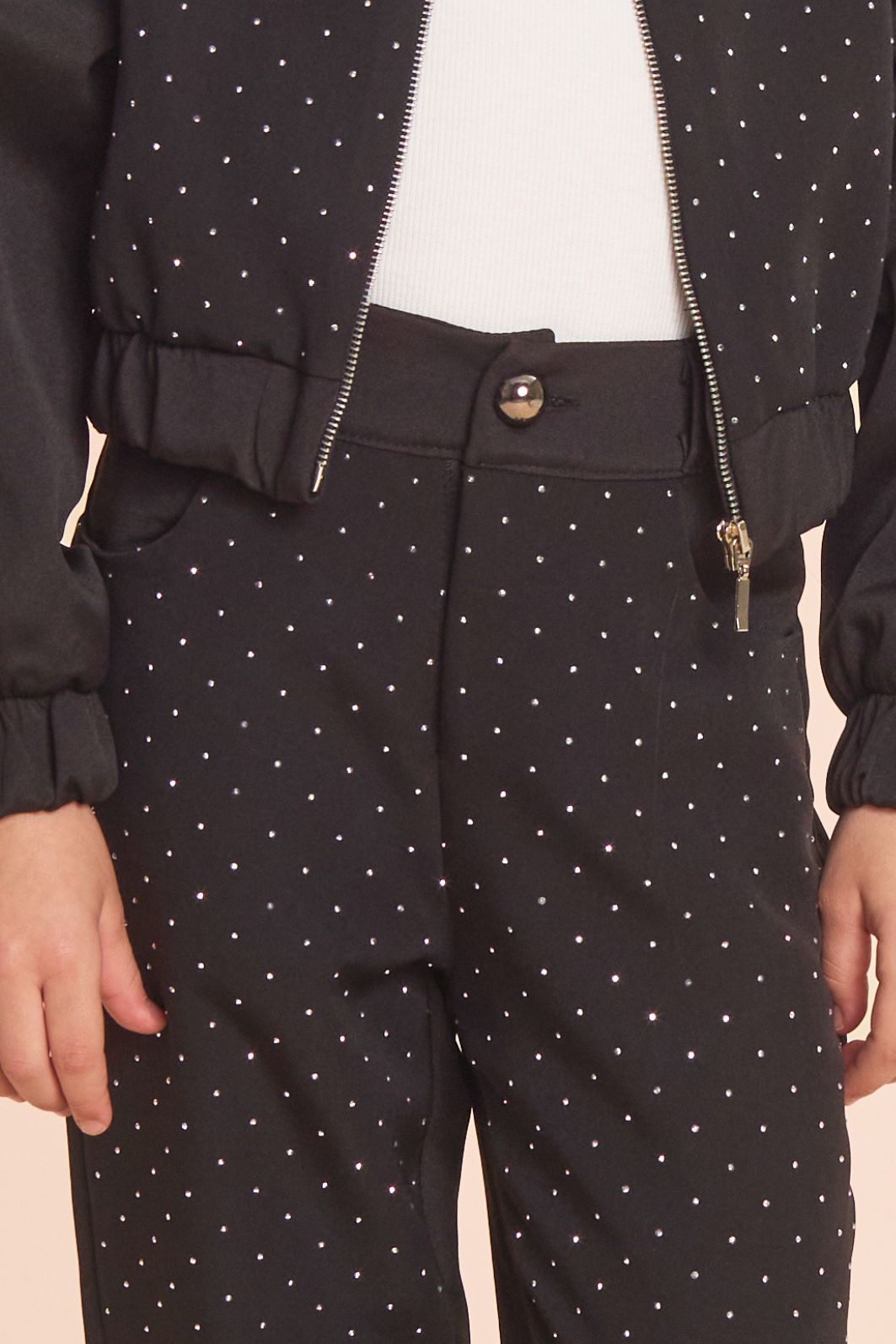 | Descrição | Calça de alfaiataria com strass. Fechamento por ziper e botão |