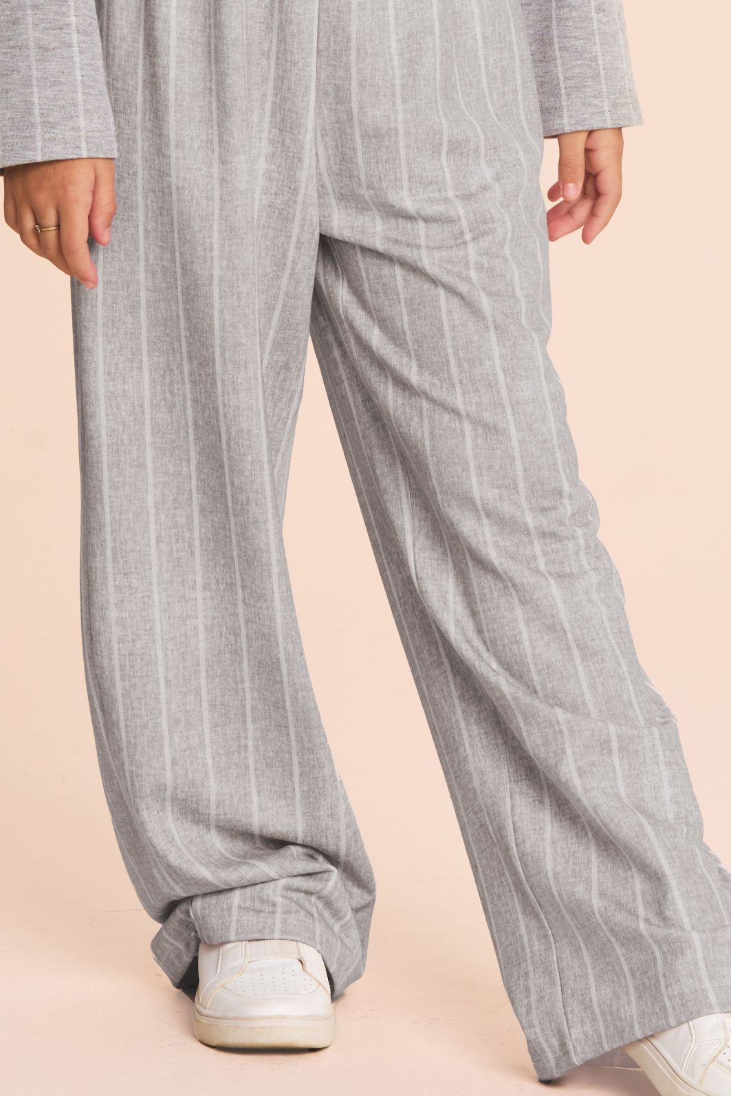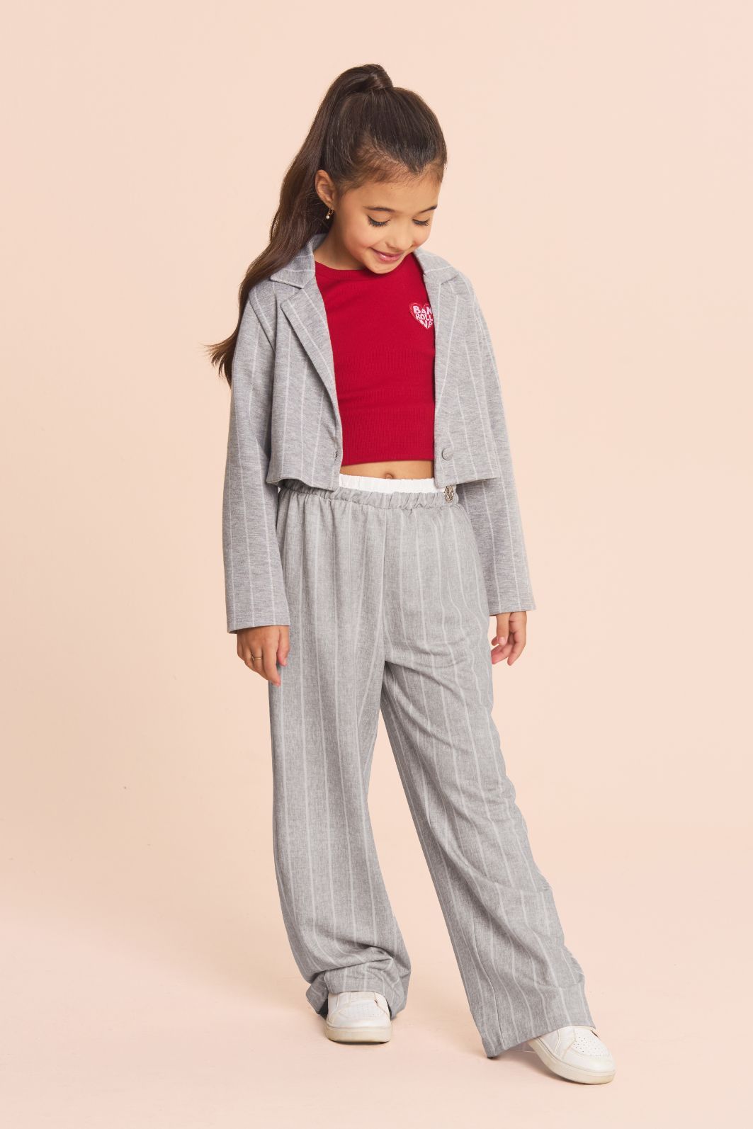 | Descrição | Calça infantil feminina em malha leve, cor cinza com listras verticais, modelagem wide leg e cós com elástico para melhor ajuste. Tecido macio e confortável, ideal para uso casual. |