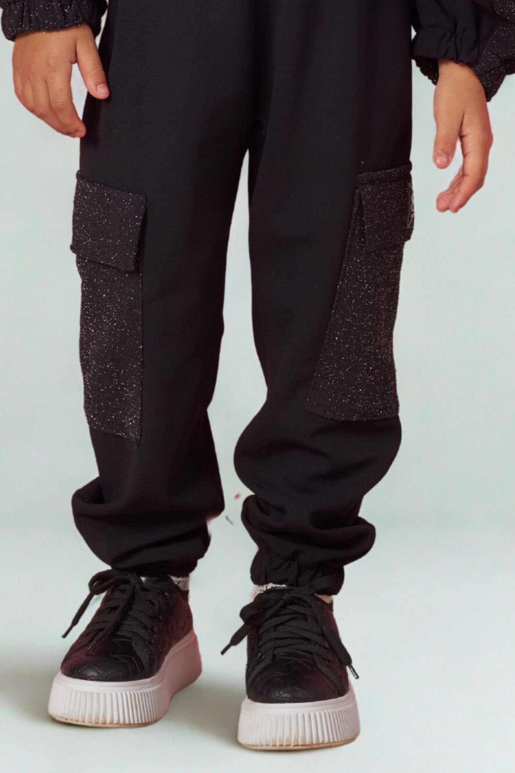 | Descrição | Calça infantil modelo jogger, com elástico na cintura e cadarço para ajuste. Possui bolsos laterais estilo cargo com detalhe em tecido brilhoso e punhos ajustados na barra, proporcionando conforto e estilo moderno ao look. |