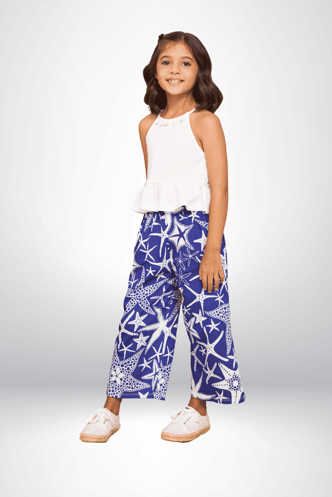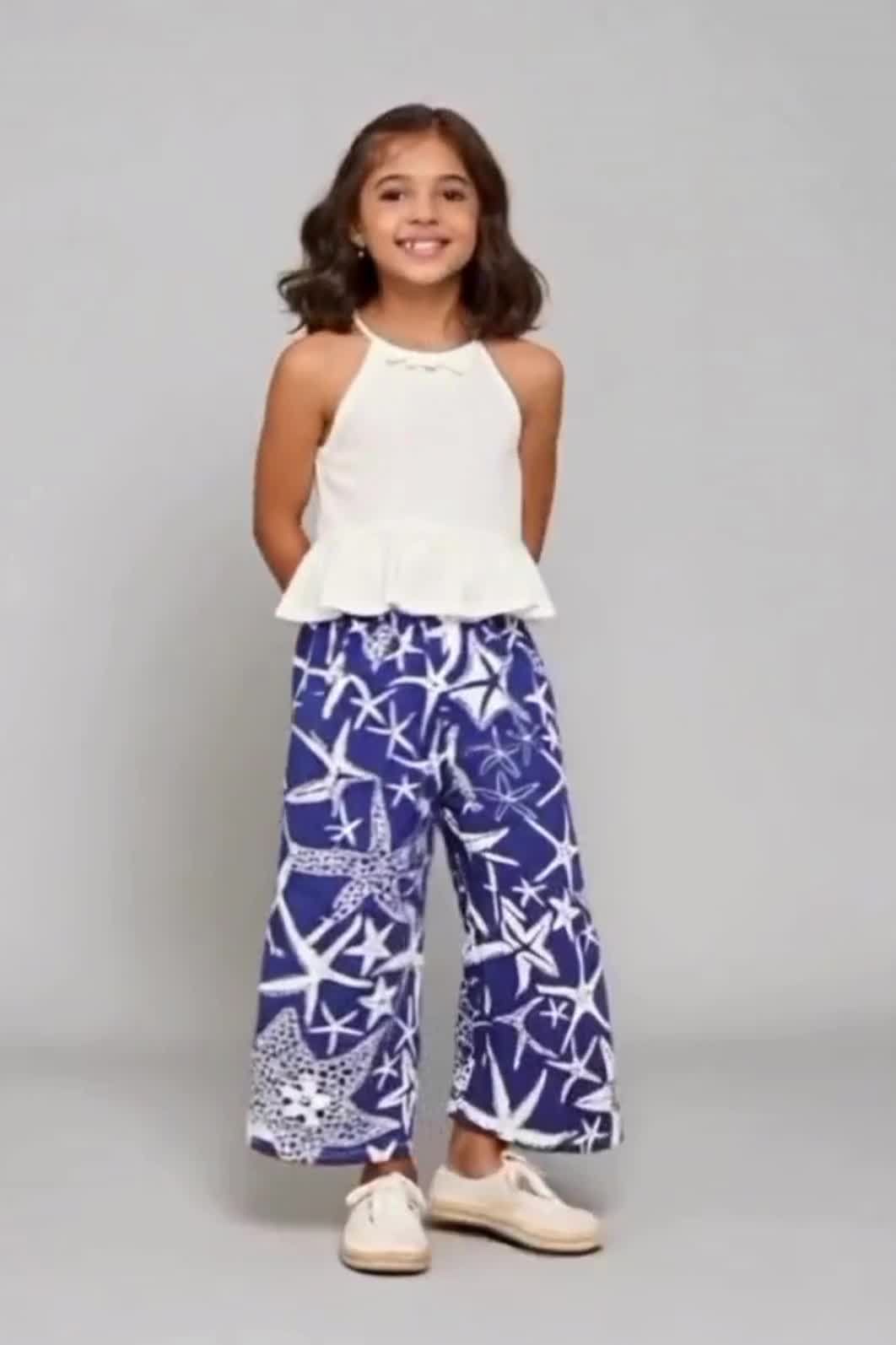 | Descrição | Este conjunto de duas peças une o charme do trabalho artesanal com a fluidez do estilo náutico. A blusa branca apresenta modelagem halter neck com textura que remete ao crochê, possuindo um delicado acabamento em babado na barra (estilo peplum) que confere volume e movimento. A calça possui modelagem pantacourt com caimento solto e confortável, confeccionada em tecido leve de fundo azul royal. Destaca-se pela estampa rotativa de estrelas-do-mar em branco, criando um contraste vibrante e moderno. É um conjunto versátil e sofisticado, ideal para ocasiões casuais e eventos de verão que pedem um look lúdico e fresco. |