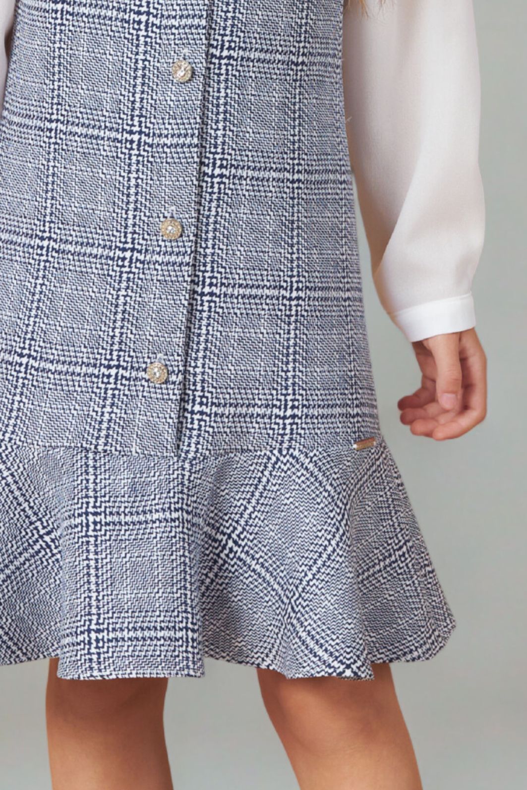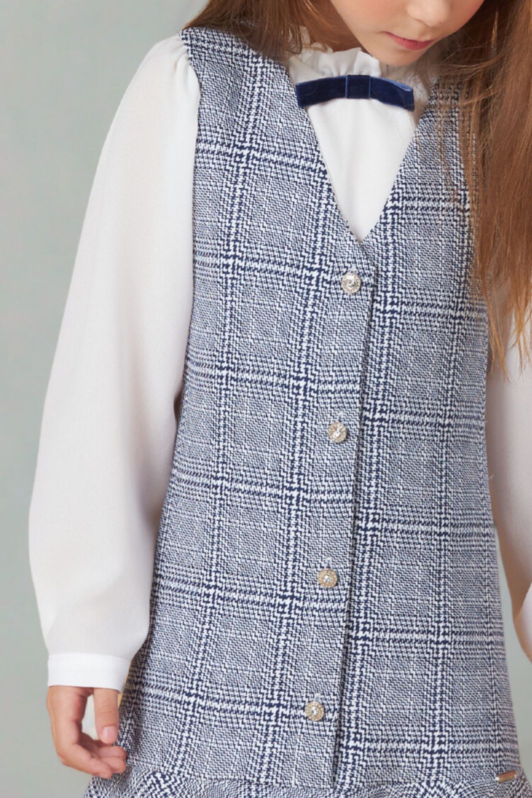 Descrição | O conjunto é composto por blusa com babado embutido no decote e laço de veludo aplicado no centro. As mangas são franzidas no topo dos ombros e apresentam abertura nos punhos com fechamento por meio de botão. Para facilitar ao vestir, a peça conta com abertura nas costas, com fechamento por meio de elástico e botão. O vestido possui decote em V embutido ao forro, assim como as cavas. Apresenta abertura frontal com fechamento por meio de botão, recorte horizontal na parte inferior e placa personalizada da marca aplicada acima do recorte. |