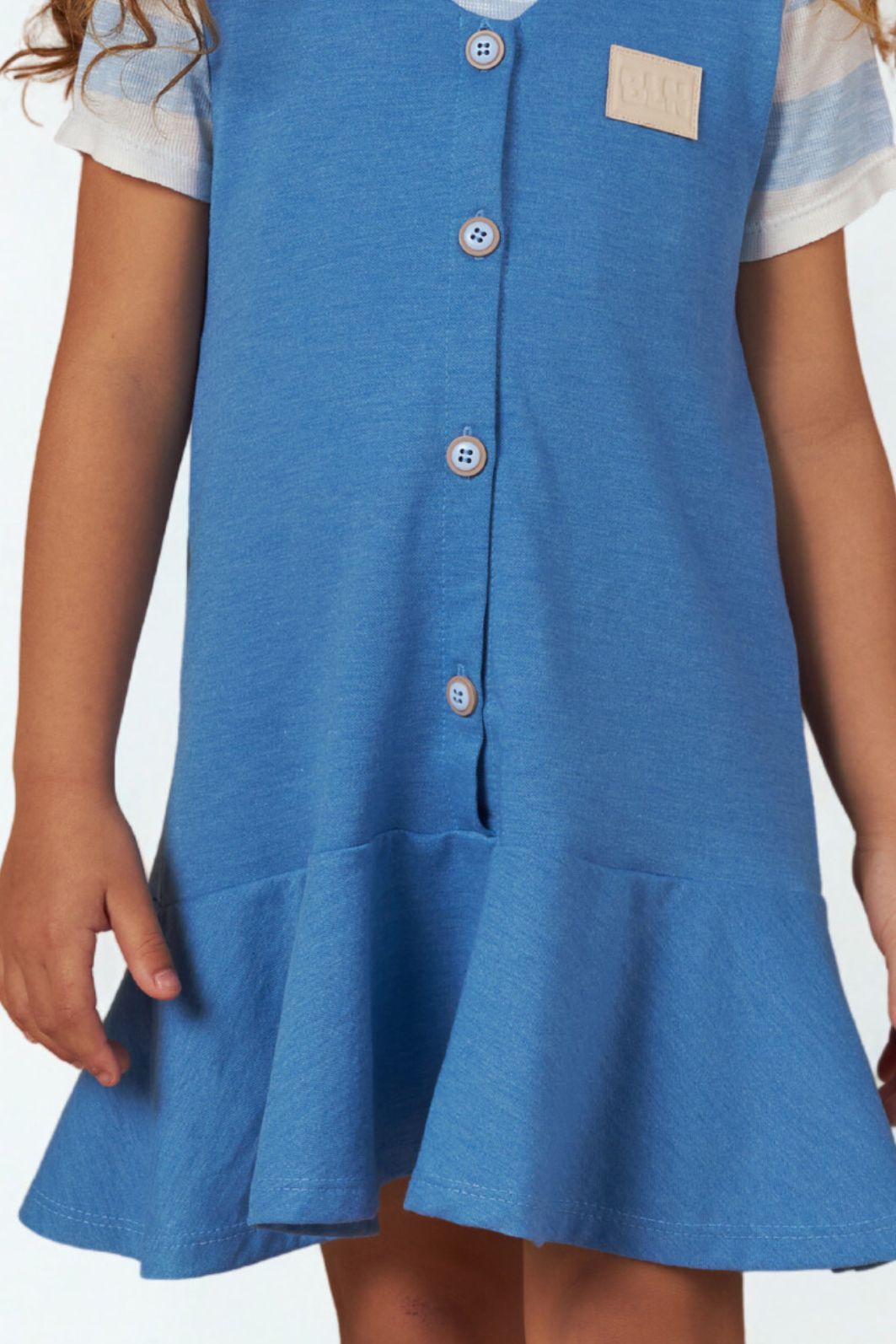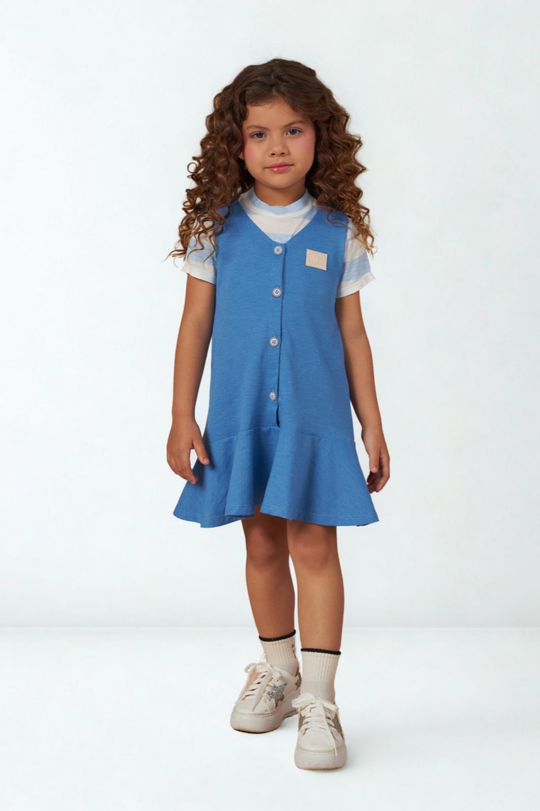 | Descrição | Conjunto infantil composto por blusa de malha canelada com gola alta e vestido sem mangas em malha leve. O vestido possui modelagem evasê com babado na barra, fechamento frontal por botões e aplicação decorativa no busto. Peça confortável e moderna, ideal para composições casuais. |