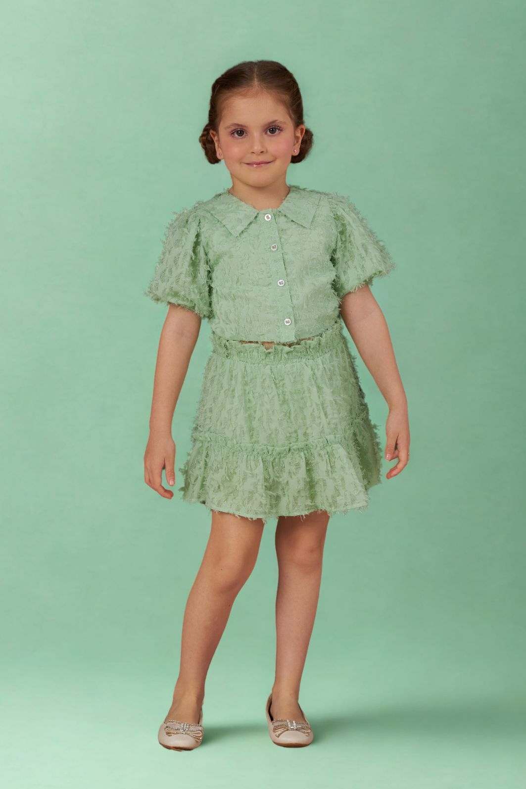 | Descrição | O conjunto infantil é composto por uma blusa e uma saia, ambas em tom verde menta. A blusa possui um design clássico com gola e fechamento frontal por botões, confeccionada em tecido texturizado que adiciona um toque delicado. A saia, de comprimento médio, apresenta babados sutis, oferecendo um estilo suave e elegante. O conjunto é ideal para ocasiões casuais, proporcionando conforto e charme à criança. |