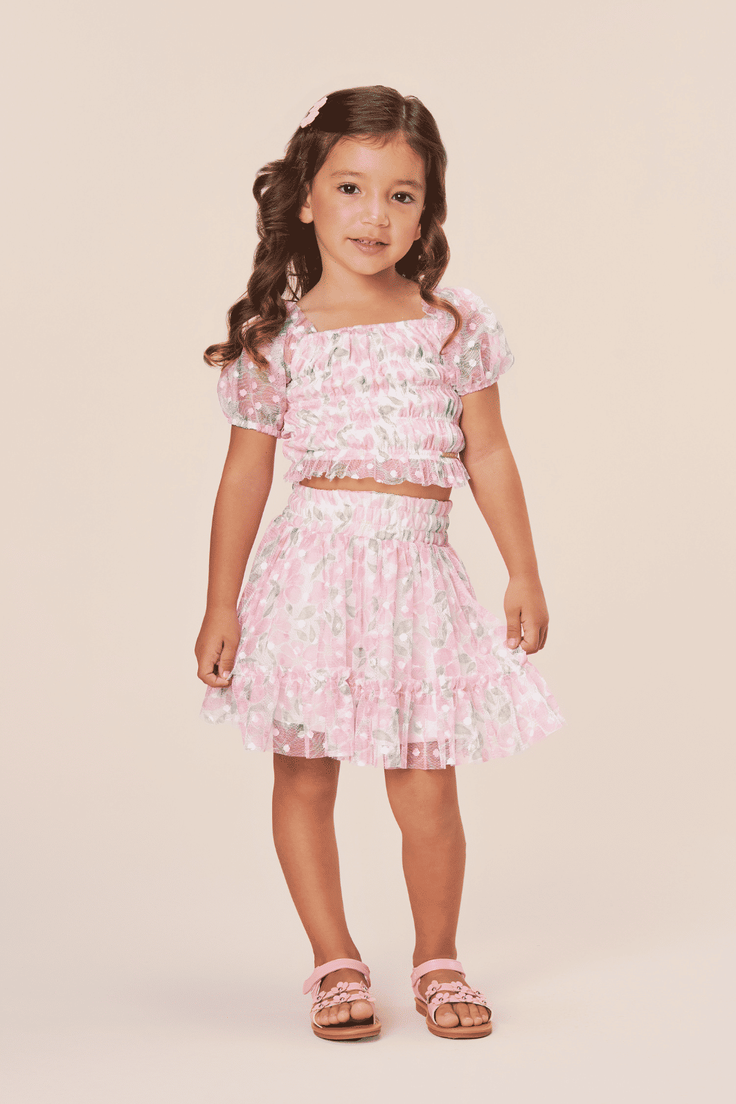 | Descrição | Conjunto estampado, composto por blusa com decote quadrado e elástico rebatido, mangas bufantes com elástico nos punhos, elásticos aplicados ao longo da extensão e saia de tule. A parte inferior da blusa apresenta tule levemente mais comprido que o forro, formando um babado transparente, com placa personalizada da marca acima do babado. A saia possui cós largo com elástico rebatido, recorte inferior franzido, efeito clochard na parte superior e short forro. |