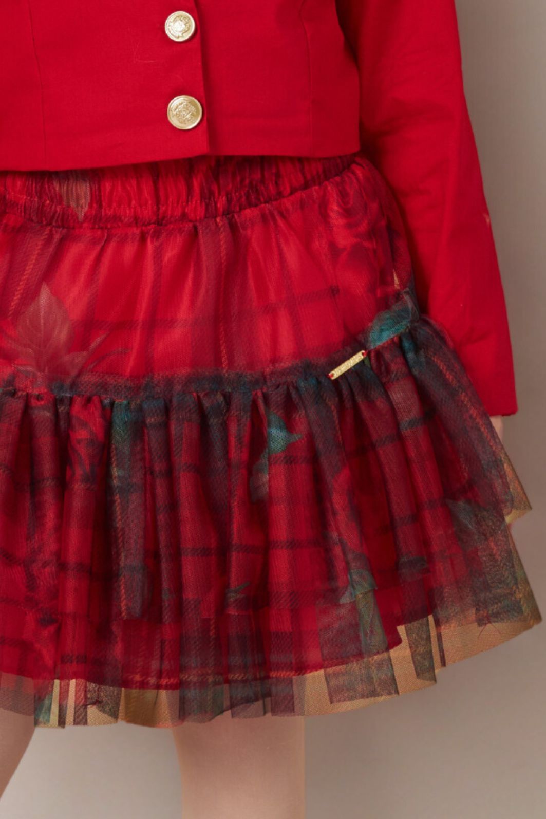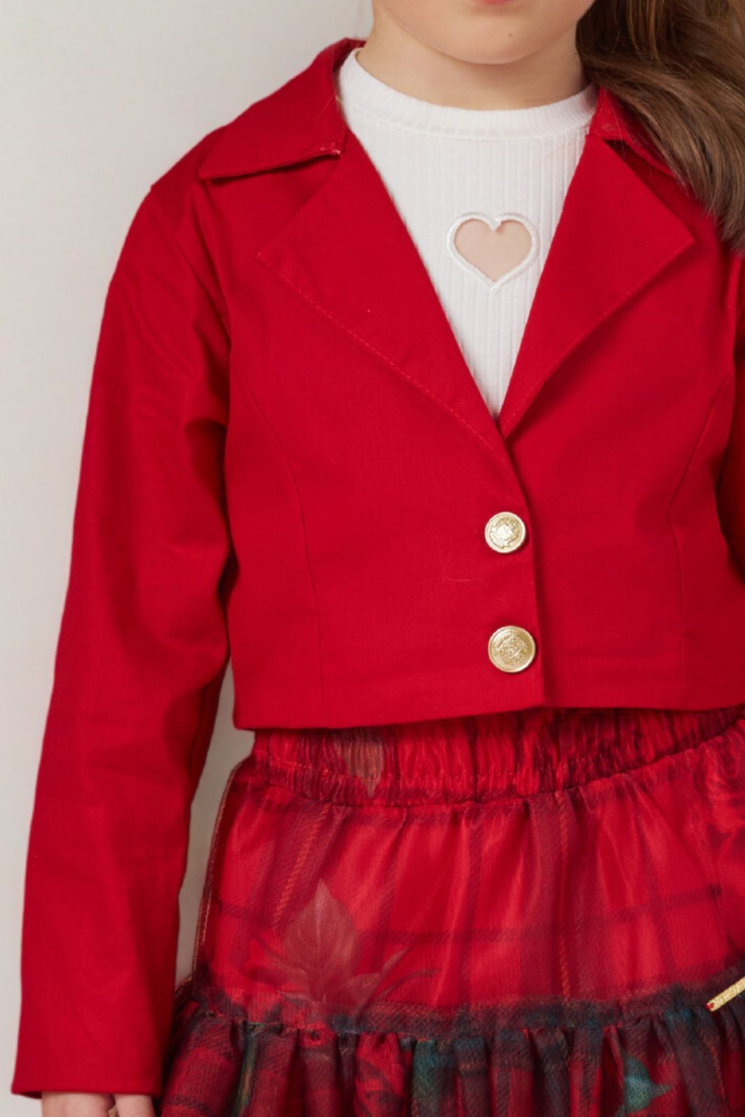 | Descrição | Conjunto infantil de duas peças, ideal para o inverno. O blazer cropped é confeccionado em tecido estruturado na cor vermelha, possui gola lapela e fechamento frontal com dois botões dourados. A saia curta e rodada é composta por camadas, sendo a interna em estampa xadrez (vermelho/verde) e a camada externa em tule transparente, conferindo volume e um toque de sofisticação. |