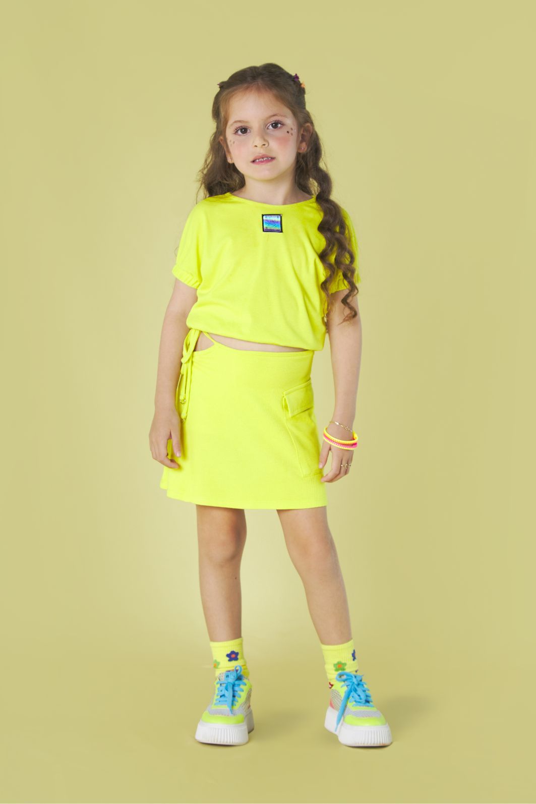| Descrição | Conjunto infantil/juvenil, cor neon verde limão/fluorescente, composto por blusa cropped/ampla de manga curta com detalhe em patch no peito e saia com design moderno. A saia apresenta cós com recorte vazado lateral e detalhe de bolso cargo aplicado, confeccionado em tecido de malha com elastano para conforto e movimento. Peças de estilo fashion, ideais para o verão. |