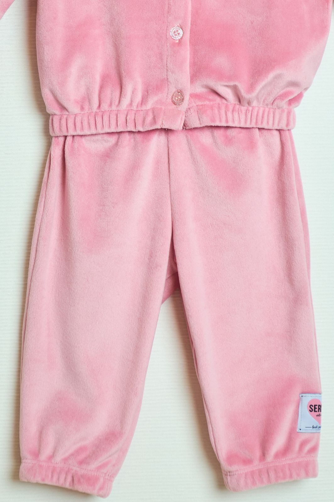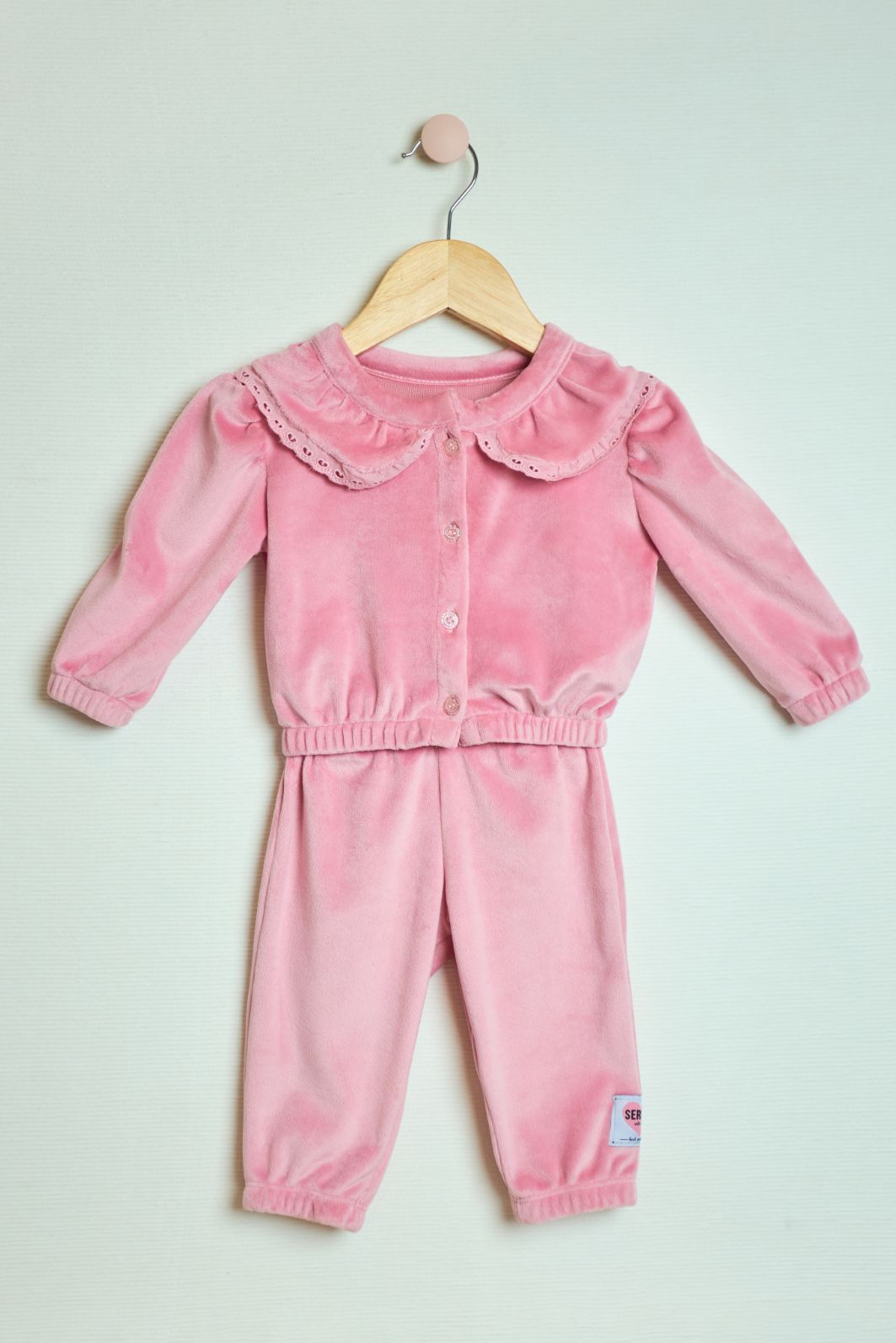 Descrição | O conjunto é composto por um casaco com decote arredondado e babado embutido no decote, com renda aplicada na extremidade externa. As mangas são franzidas nas cavas e possuem elástico nos punhos, assim como na cintura. O casaco conta ainda com abertura frontal e fechamento por meio de botões. A calça apresenta elástico no cós e nos punhos para maior conforto, além de etiqueta personalizada da marca aplicada na lateral de uma das pernas. |
