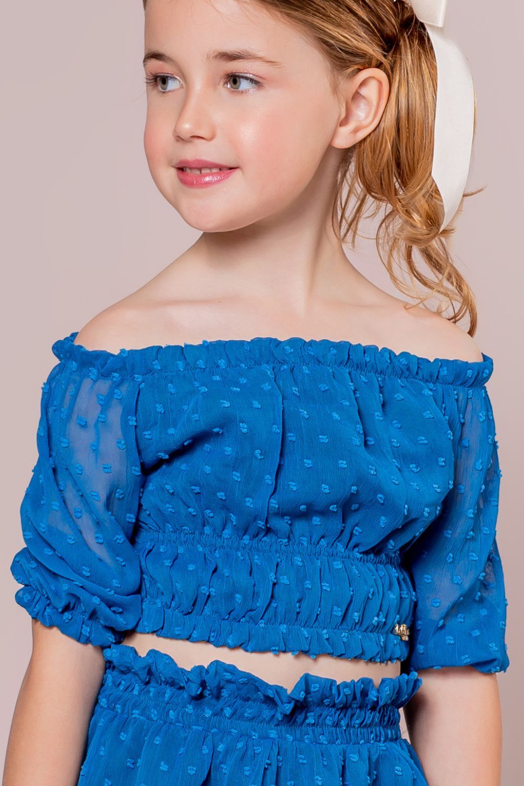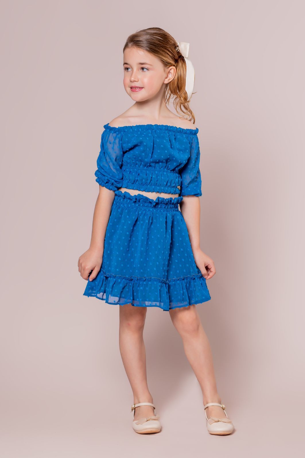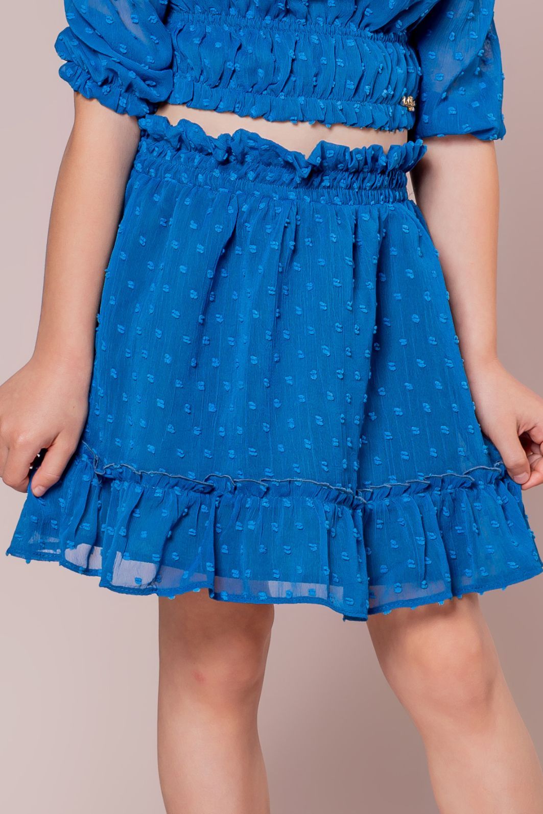 | Descrição | Conjunto infantil feminino em tecido texturizado de poá, na cor azul royal. Top cropped modelo ciganinha (ombro a ombro), com elastex no busto e nas mangas curtas com babado. Saia rodada com lastex na cintura e detalhe de babado na barra |