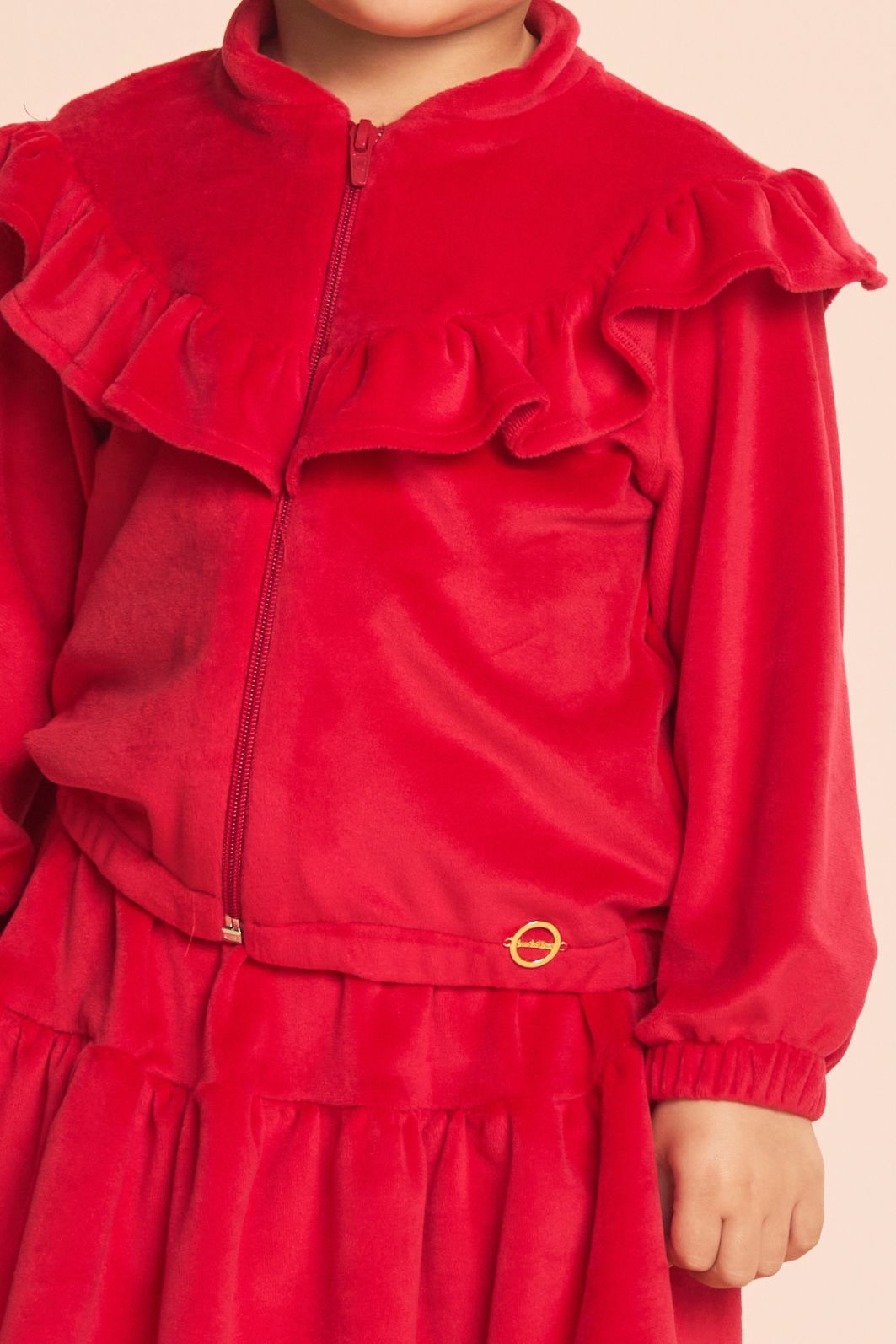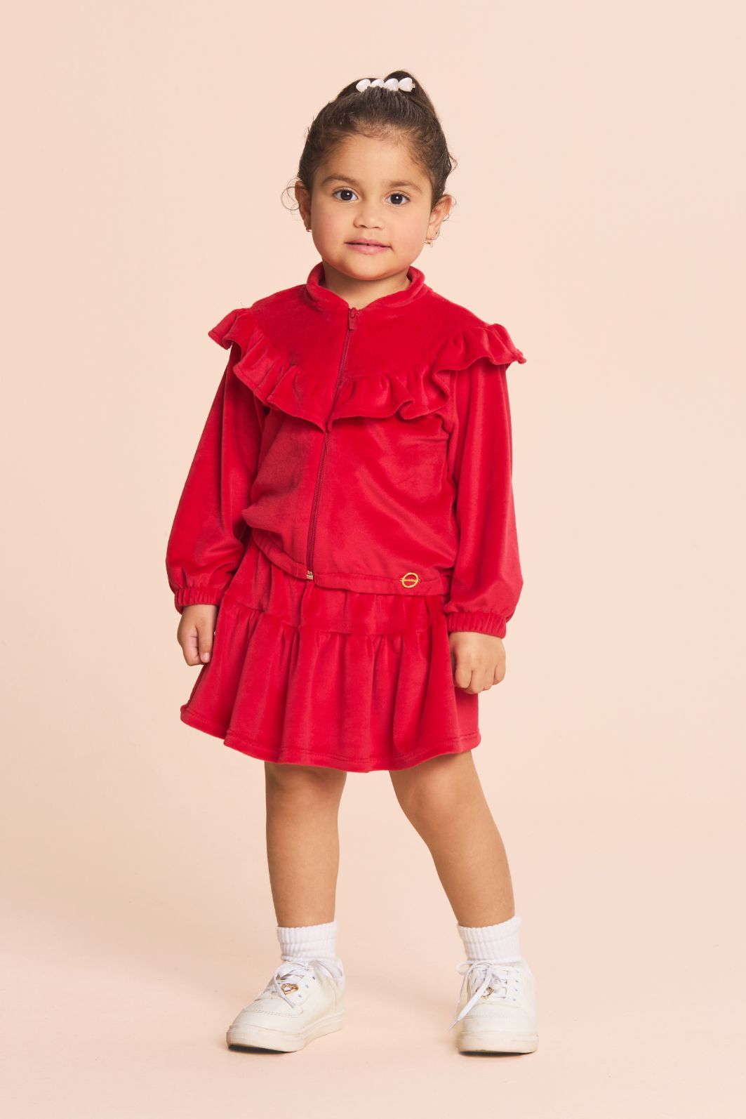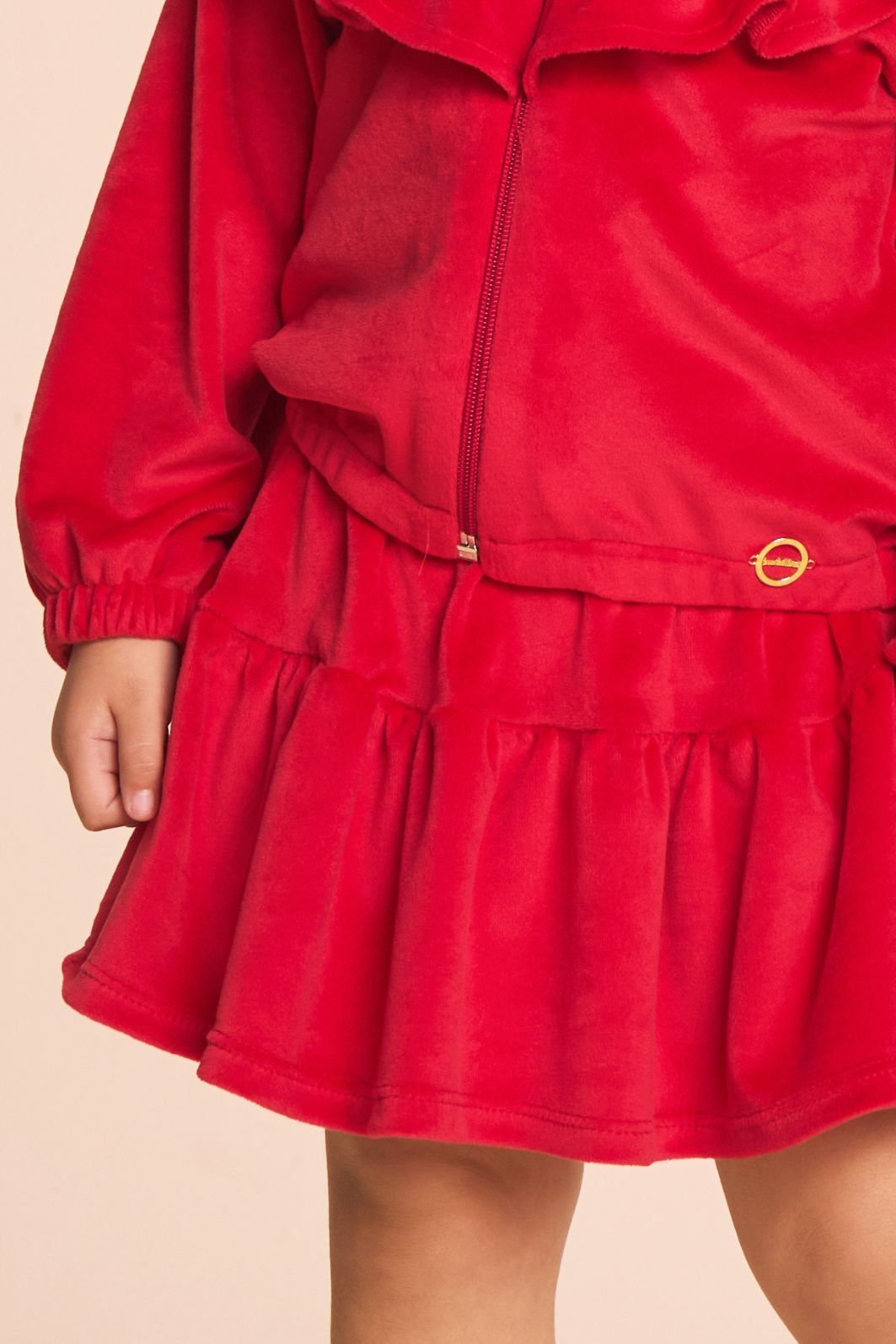 Descrição | O conjunto é composto por uma jaqueta com decote arredondado e mangas com elástico aplicados nos punhos, bem como na cintura. A peça apresenta pala com babado embutido e placa personalizada da marca aplicada acima da linha da cintura. Conta ainda com abertura frontal com fechamento por meio de zíper, garantindo praticidade ao vestir. A saia, por sua vez, possui elástico no cós e recorte horizontal centralizado, além de short forro para maior conforto. |