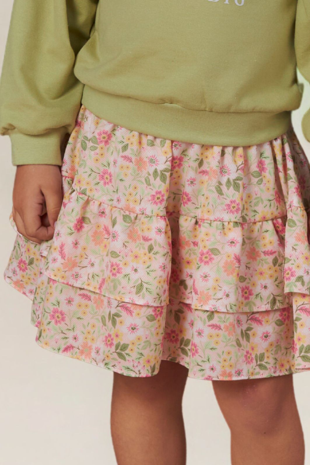 | Descrição | Conjunto infantil composto por blusa em moletinho verde com estampa frontal em lettering, mangas longas bufantes e babadinhos nos ombros. Saia em tecido leve com estampa floral multicolorida, modelagem em camadas com babados e cós ajustável. Look confortável e delicado, ideal para o dia a dia. |