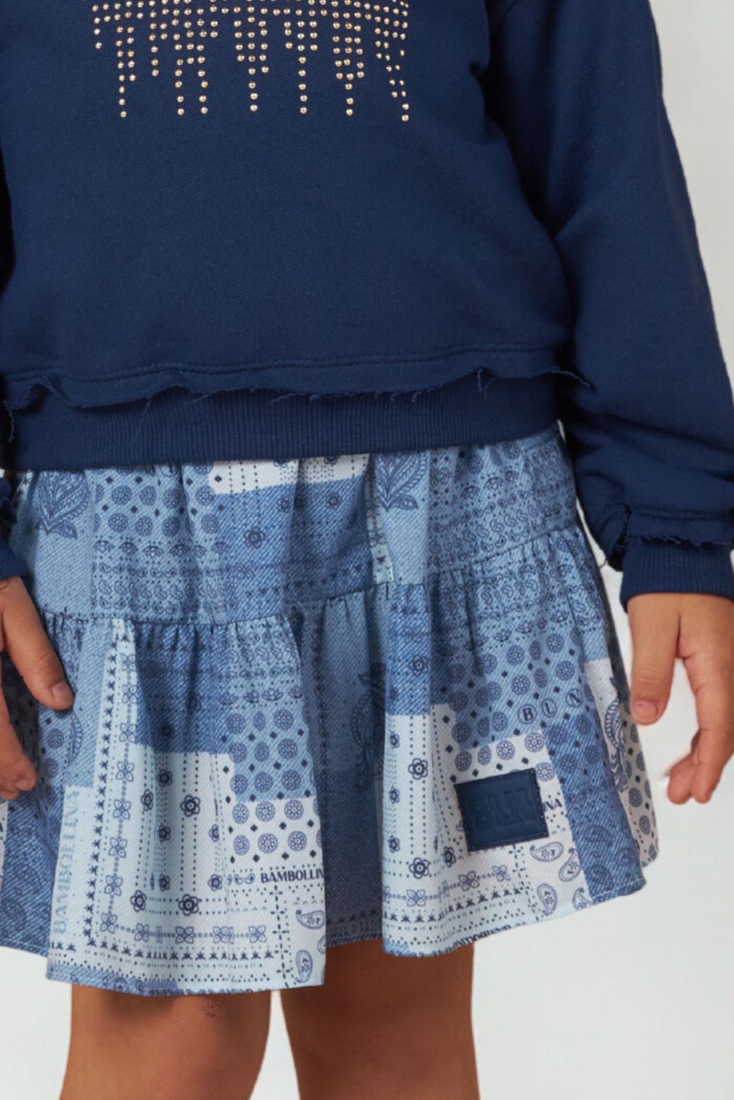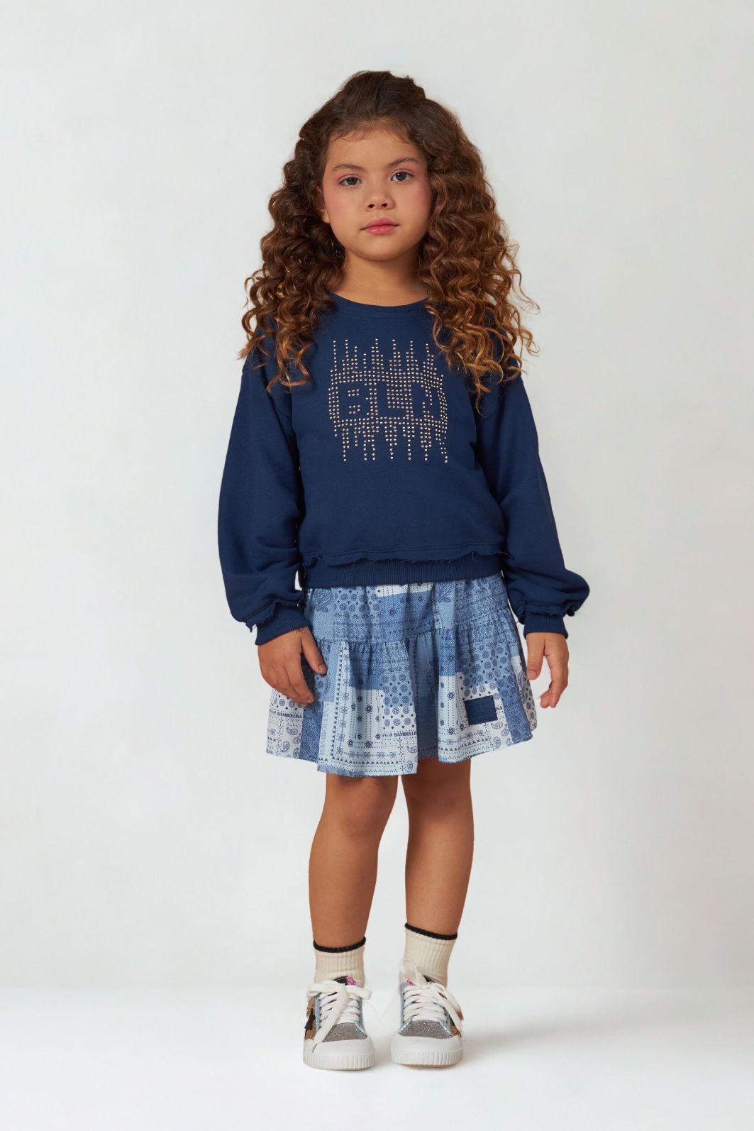 | Descrição | Conjunto infantil composto por blusa em moletom leve com mangas longas, aplicação frontal com strass formando a escrita “BLN”. Acompanha saia em tecido estampado com recortes e babados, proporcionando movimento e conforto. Look moderno e casual, ideal para o dia a dia. |