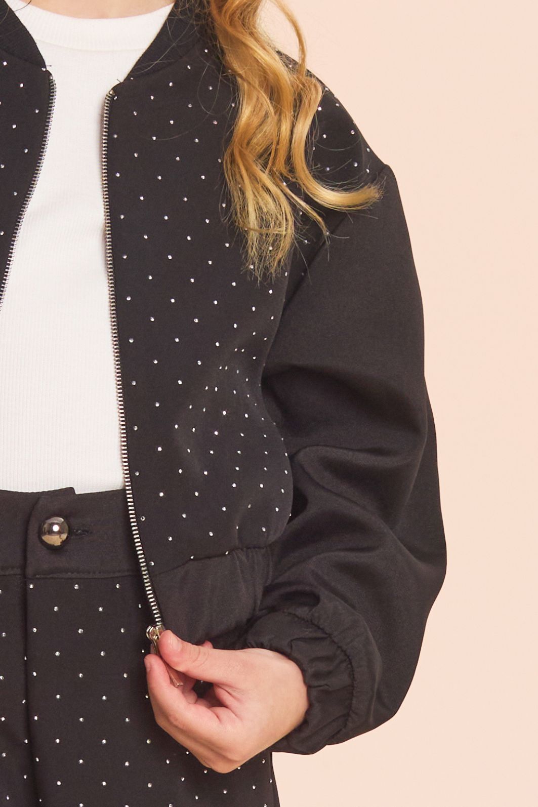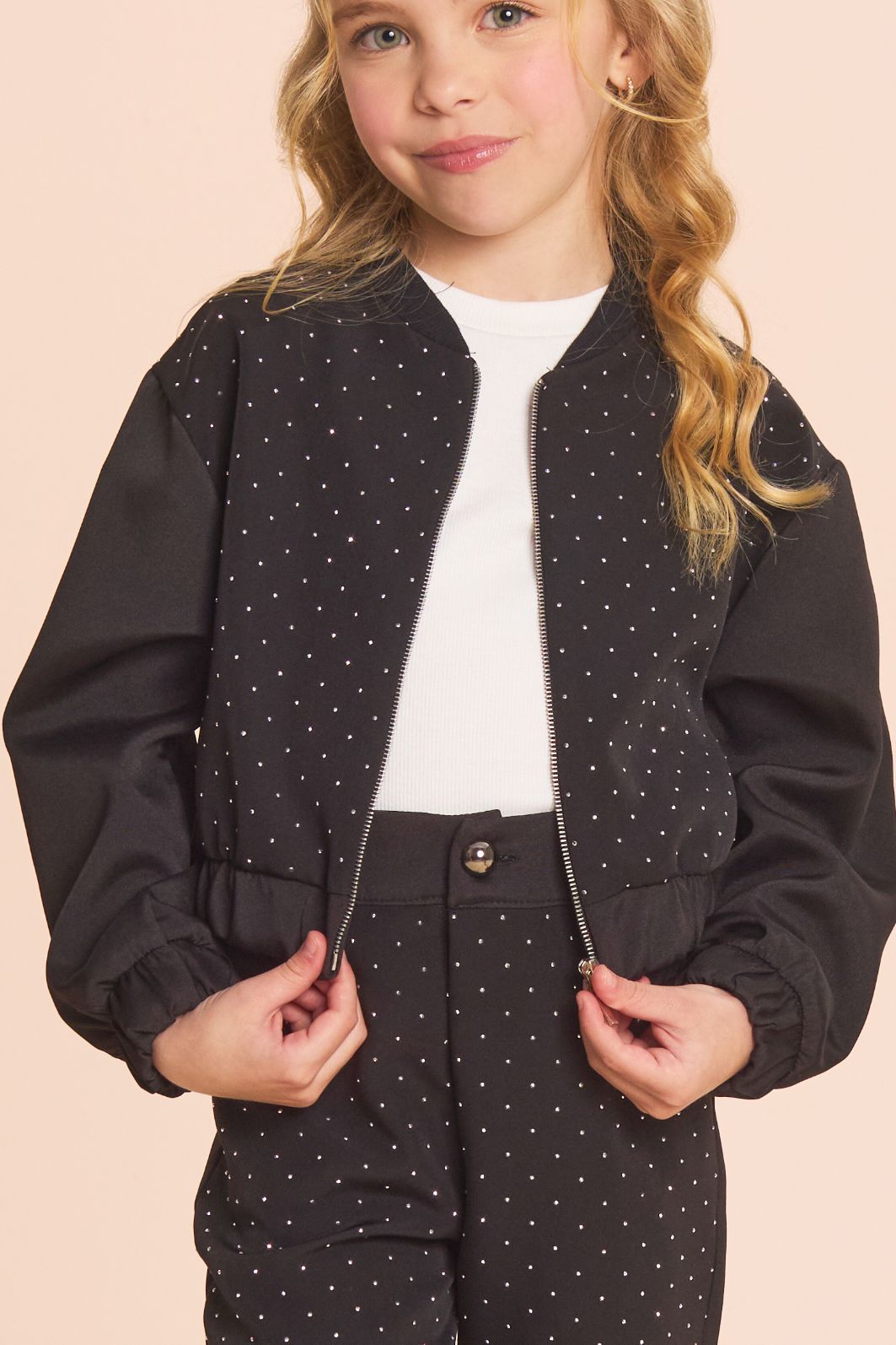| Descrição | Jaqueta infantil confeccionada em alfaiataria com brilhos. Possui modelagem estilo bomber, com gola redonda, mangas longas e elástico nos punhos e na barra para melhor ajuste. Apresenta design moderno e confortável, ideal para compor looks casuais e de meia-estação. |