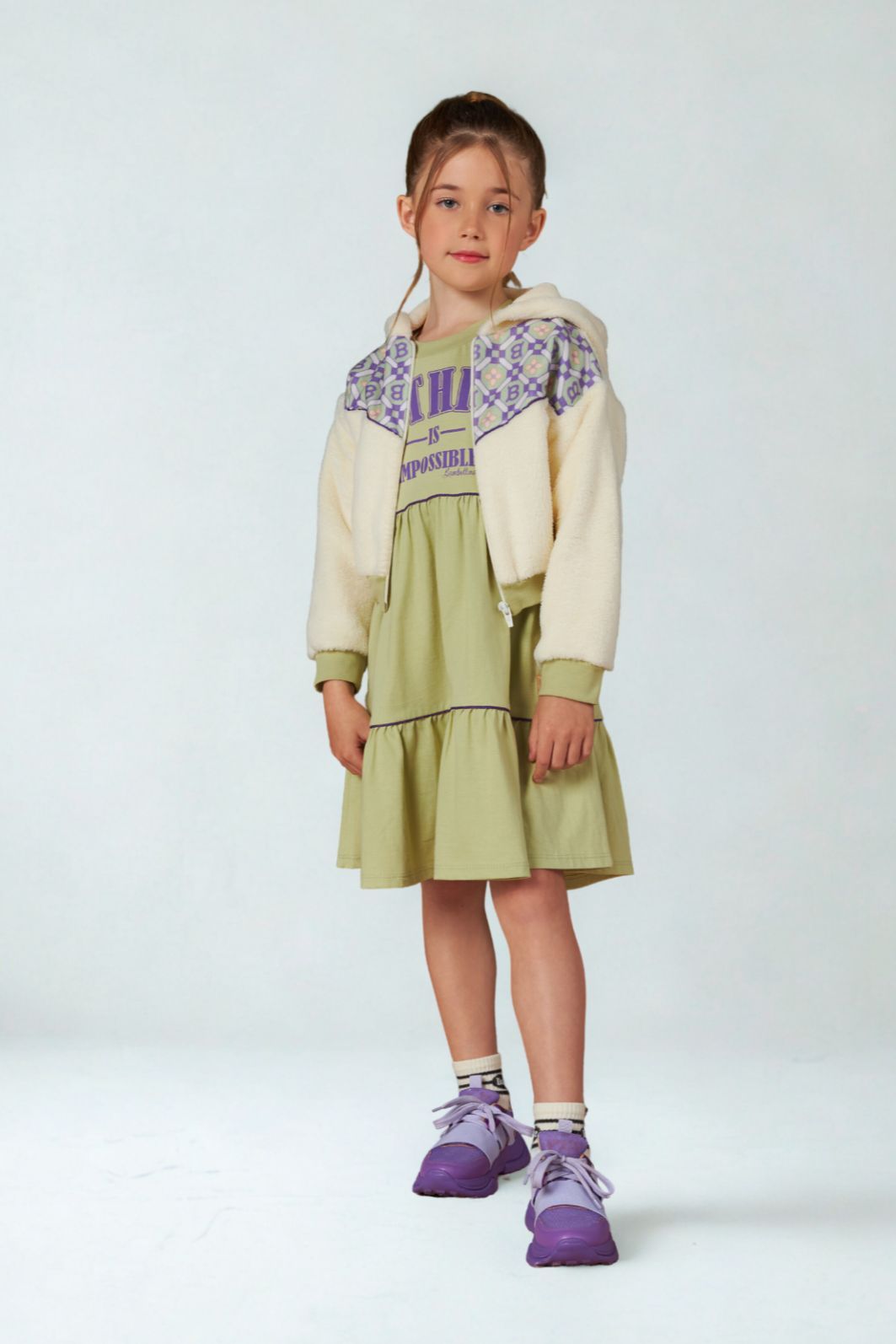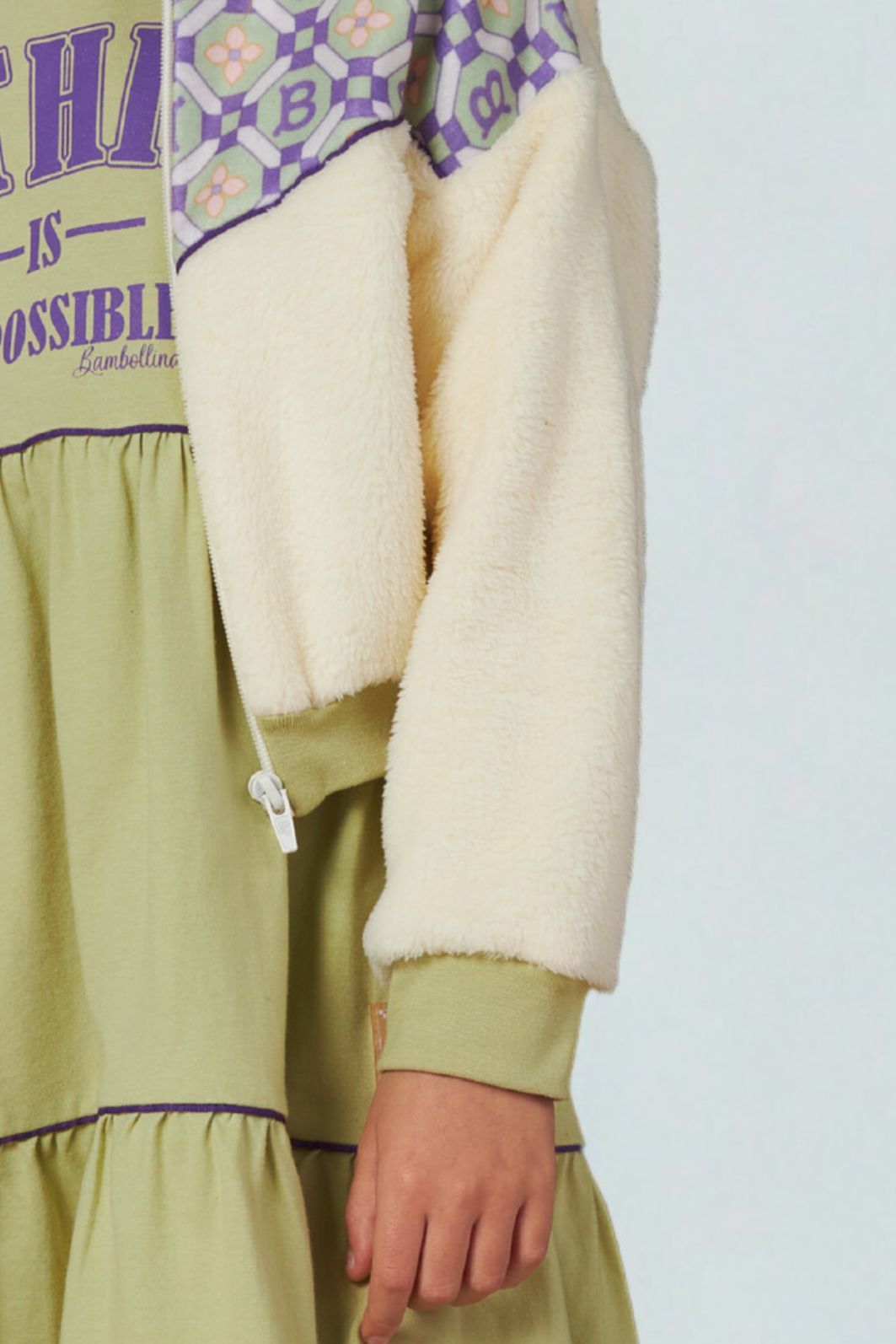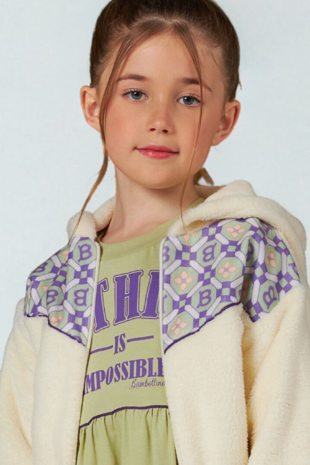 | Descrição | Jaqueta infantil confeccionada em tecido peluciado macio, com recorte superior em tecido estampado geométrico. Possui capuz, fechamento frontal por zíper, punhos e barra com acabamento em ribana para melhor ajuste. Modelagem ampla e confortável, ideal para os dias frios. |