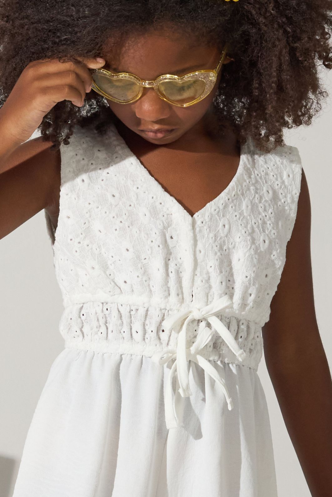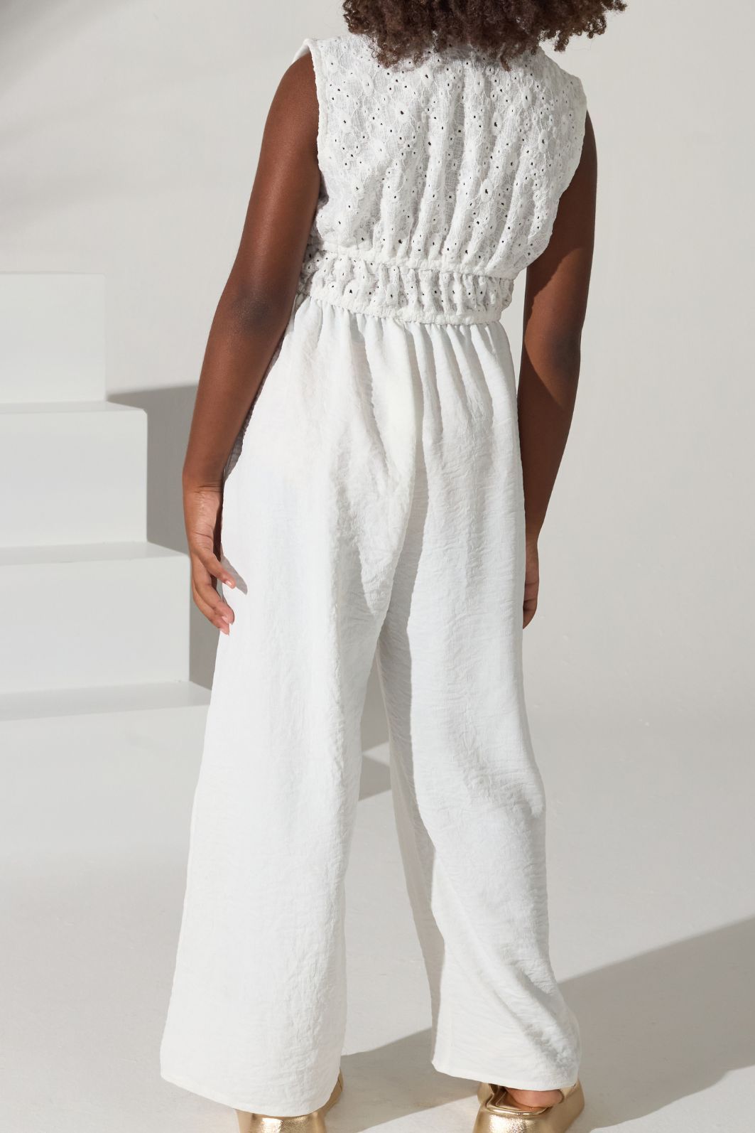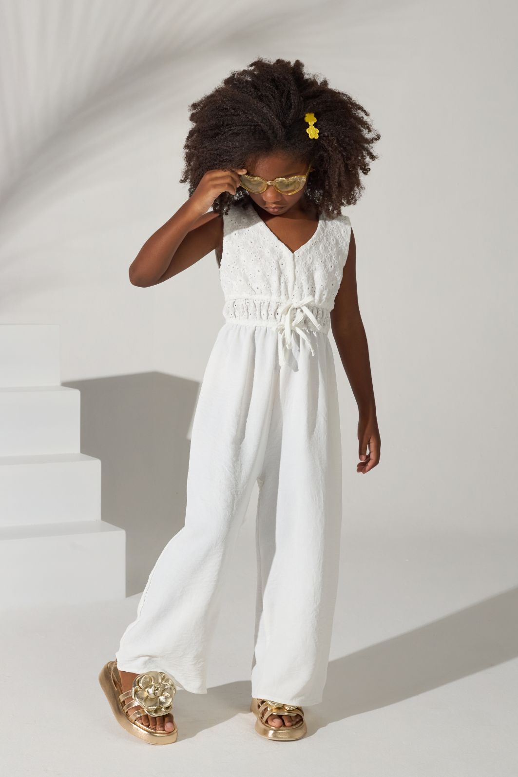 | Descrição | Macacão infantil confeccionado em tecido leve com detalhes em laise, modelo longo sem mangas, decote em V, cintura com amarração frontal e elástico nas costas, proporcionando ajuste confortável, caimento solto e ideal para uso em dias quentes. |