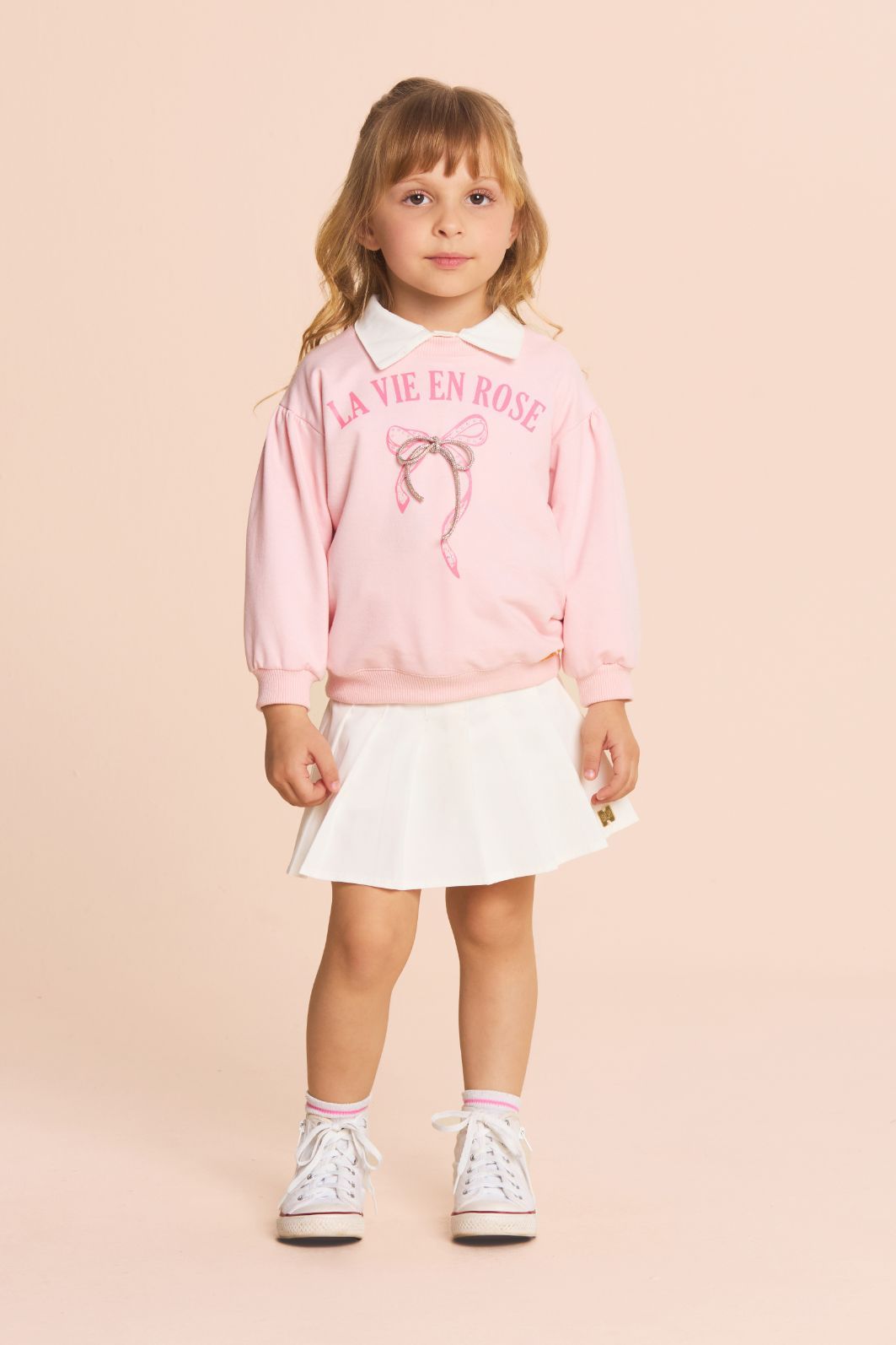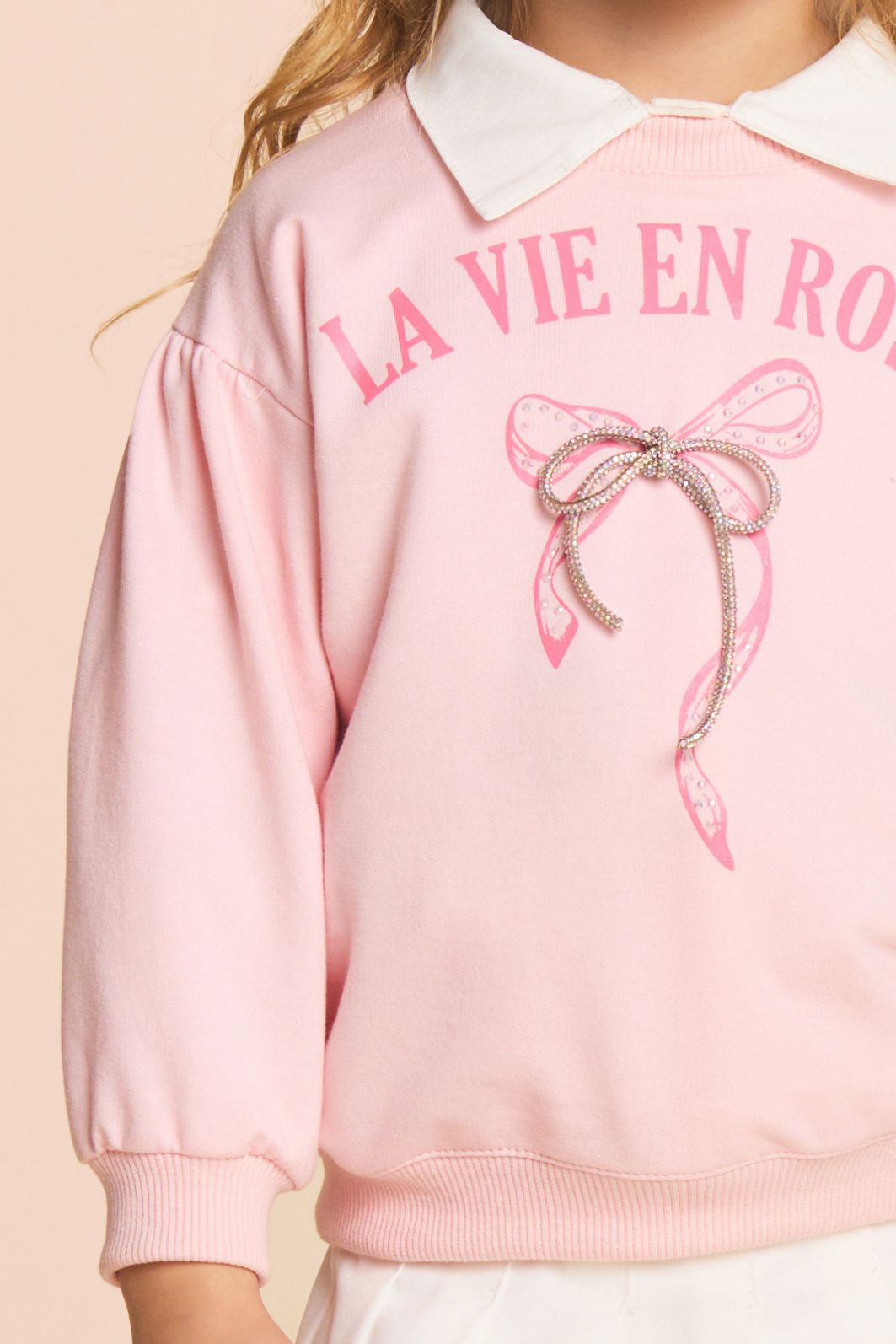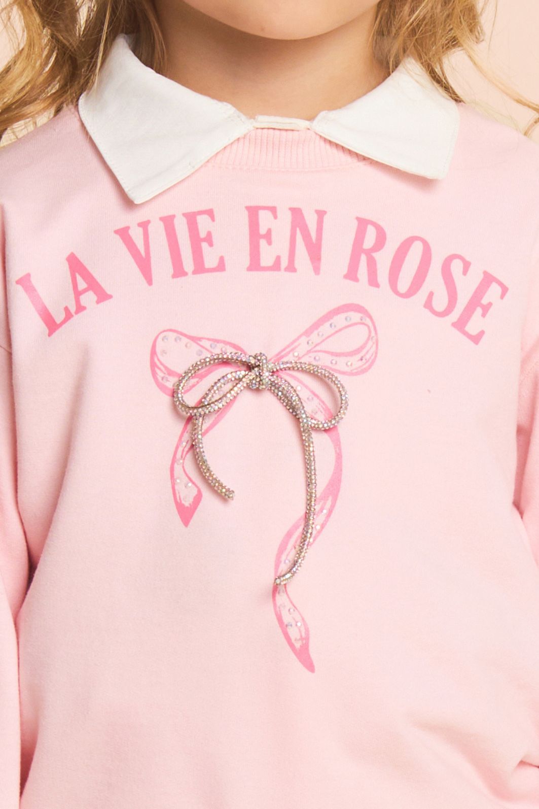 | Descrição | Moletom infantil feminino, modelagem reta com mangas longas e punhos ajustados. Possui estampa frontal “La Vie En Rose” com laço central em strass e acabamento confortável. |