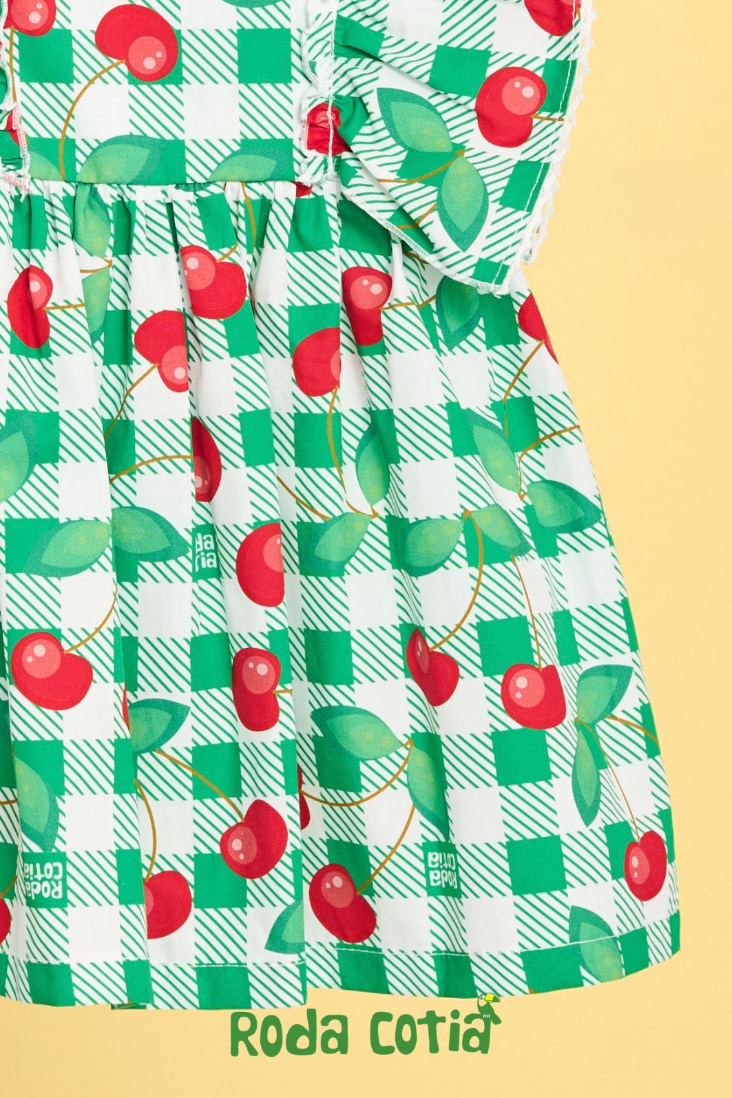 | Descrição | Vestido infantil com estampa de cerejas sobre fundo xadrez verde e branco. Possui mangas detalhadas com renda, com corte rodado e estilo retrô. Ideal para ocasiões informais e clima quente, proporcionando conforto e charme. |