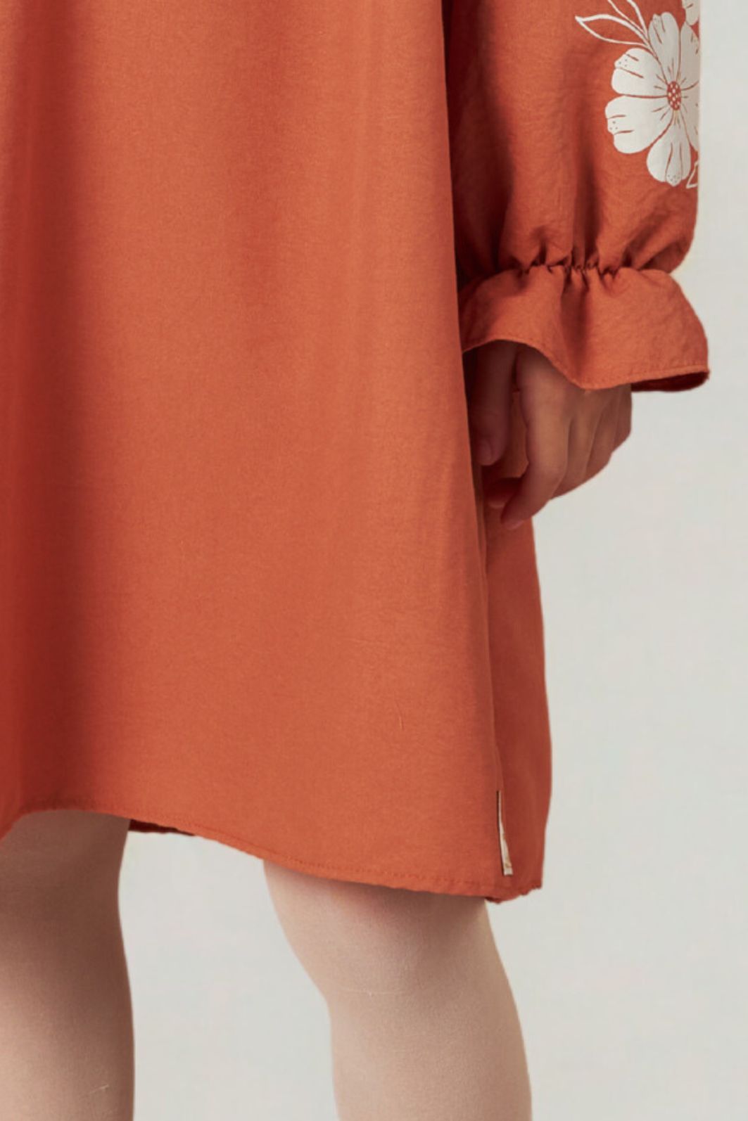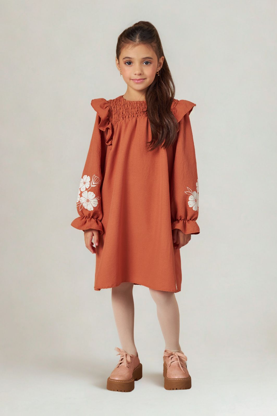 Adicionar| Descrição | Vestido infantil de manga longa em tecido texturizado. A peça possui lastex franzido na parte frontal do decote, criando um efeito drapeado. Os ombros são adornados com babados, conferindo um toque delicado. As mangas longas contam com silk floral e acabamento com elástico nos punhos, garantindo conforto e ajuste. |