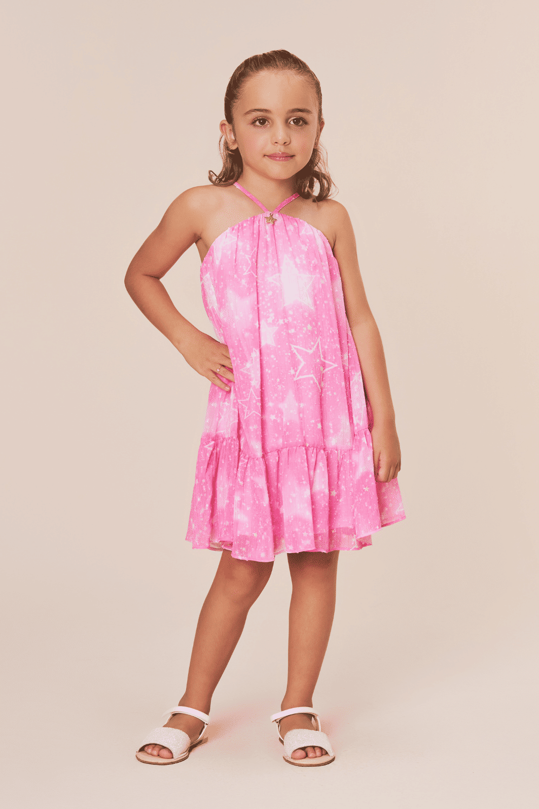 Descrição | Vestido confeccionado em chiffon com estampa de estrelas. Possui decote embutido ao forro e viés aplicado para amarração, com placa personalizada da marca no centro do decote. Apresenta recorte aplicado franzido na parte inferior da saia e elástico rebatido nas costas. |
