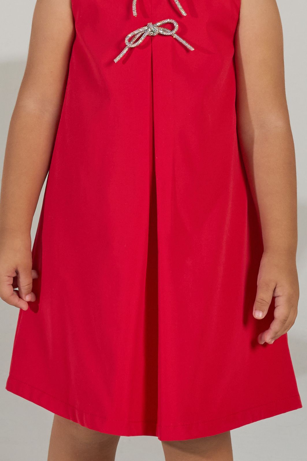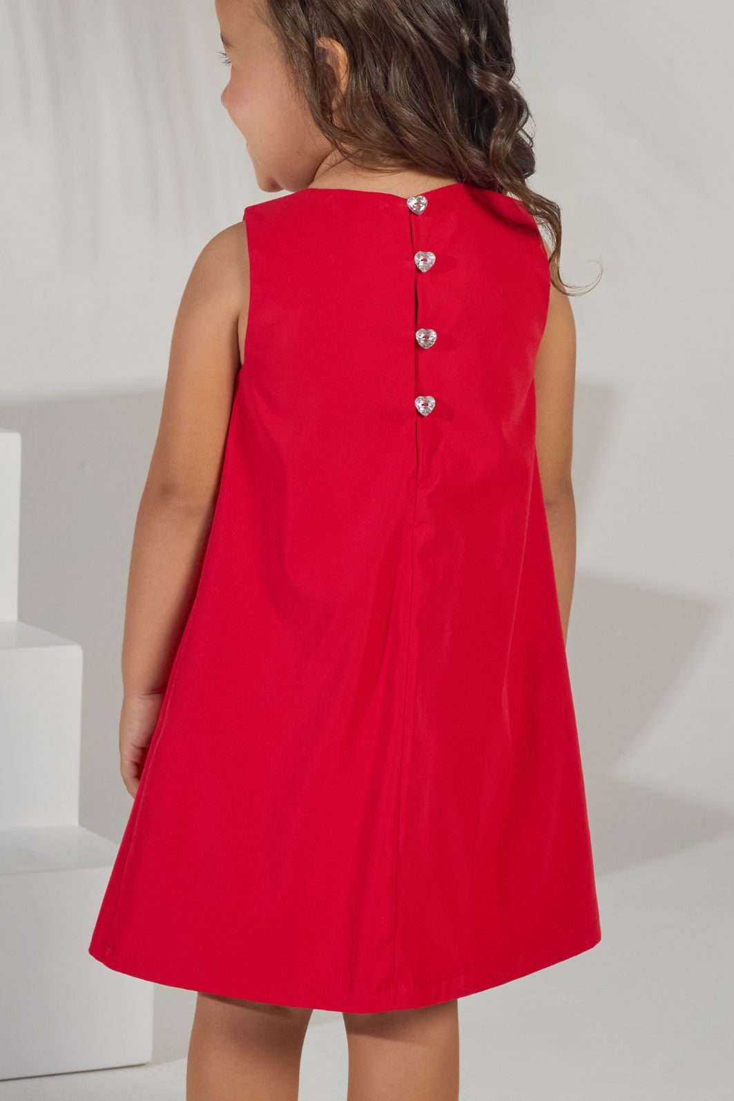 | Descrição | Vestido infantil sem mangas, confeccionado em tecido leve com modelagem em A. Possui decote redondo, recorte frontal central para melhor caimento e dois detalhes de laços brilhosos na parte superior. Peça de acabamento limpo, com costuras reforçadas e caimento soltinho. |