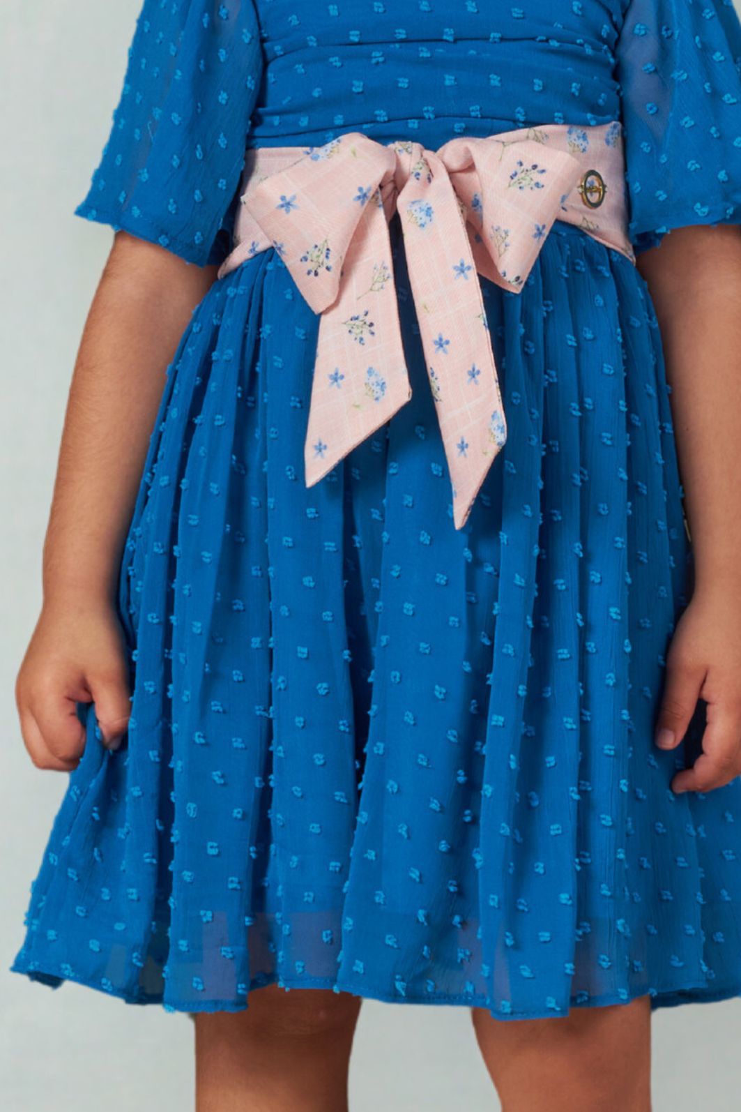 | Descrição | Vestido infantil confeccionado em tecido leve com textura poá em relevo. Possui modelagem evasê com saia rodada e mangas curtas bufantes. A parte superior apresenta recortes delicados e faixa na cintura com laço frontal em tecido rosa estampado floral, garantindo contraste e charme ao visual. Fechamento posterior por zíper e forro interno para maior conforto. |