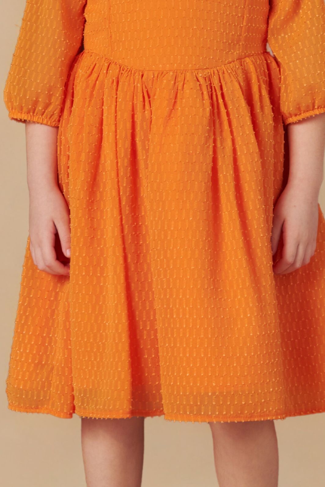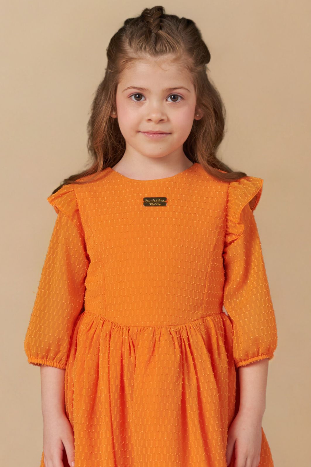 | Descrição | Vestido infantil laranja, confeccionado em tecido com textura delicada. Possui mangas bufantes com elástico nos punhos e gola redonda. A peça conta com uma saia rodada e acabamento com costuras precisas. Detalhe de placa de metal na parte superior central. Design clássico e confortável, ideal para ocasiões casuais ou semi-formais. |