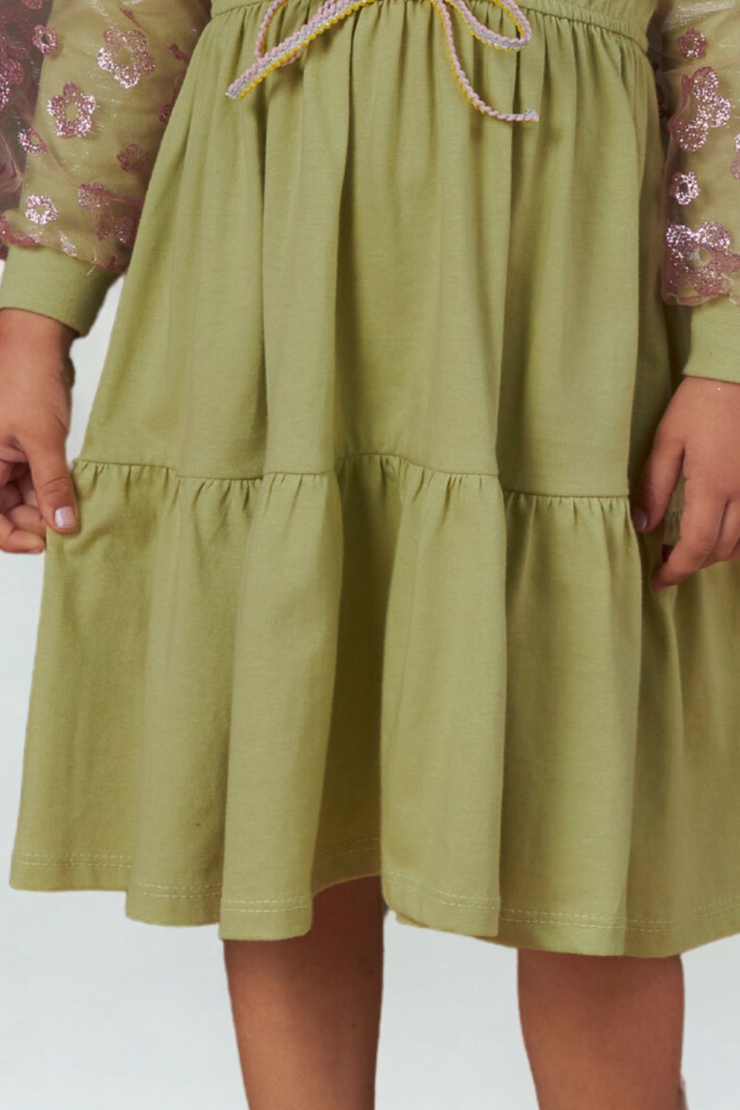 | Descrição | Vestido infantil confeccionado em tecido leve na cor verde, com mangas longas bufantes em tule floral. Possui cintura ajustável com cordão para amarração, recorte na saia com leve babado e modelagem confortável, ideal para ocasiões casuais ou especiais. |