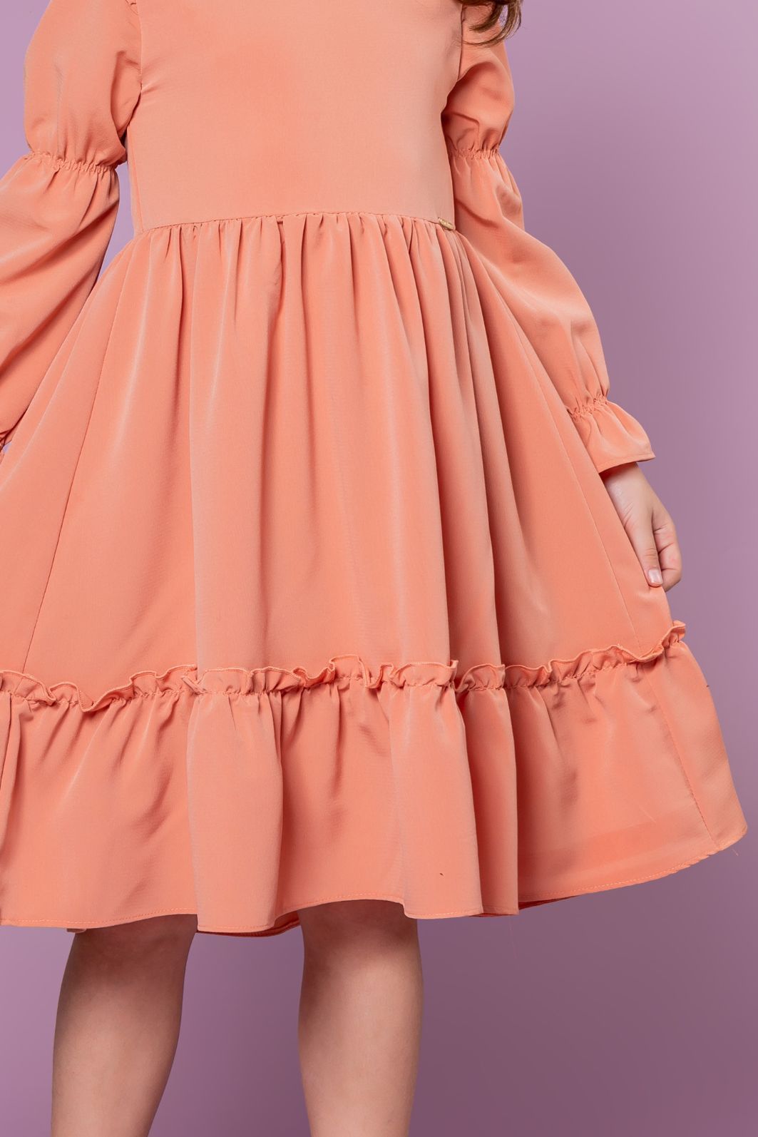 | Descrição | Vestido infantil com mangas longas e detalhes de babado nas mangas e na saia. Confeccionado em tecido fluido, possui modelagem solta e elegante, ideal para ocasiões casuais e românticas. |