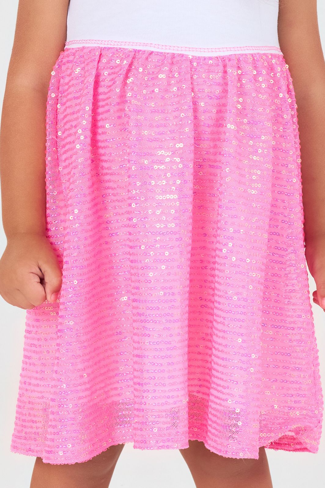 | Descrição | Vestido infantil confeccionado em meia malha, com saia em paetê, proporcionando brilho e leveza à peça. Possui modelagem evasê, sem mangas, garantindo conforto, bom caimento e visual moderno para o uso infantil. |