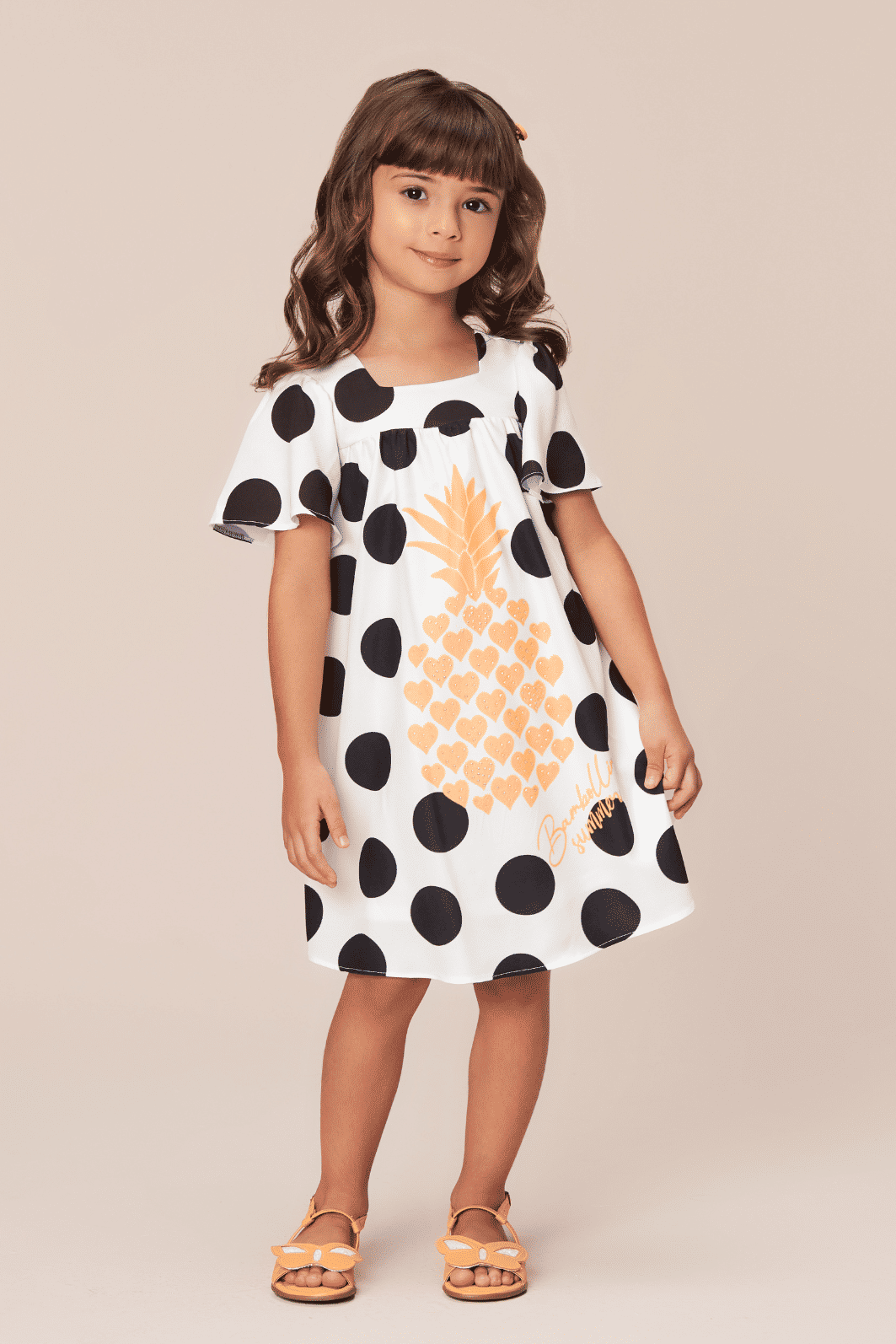 | Descrição | O vestido apresenta pala dupla e mangas amplas, com strass aplicado sobre a estampa de abacaxi. A peça também conta com placa personalizada da marca na parte inferior frontal. Para facilitar ao vestir, possui abertura nas costas com fechamento por elástico e botões. |