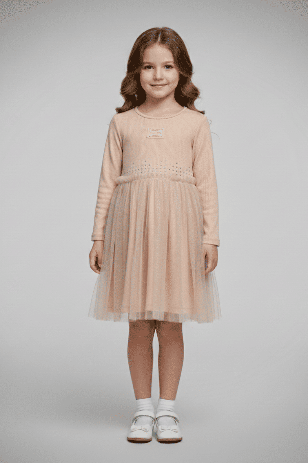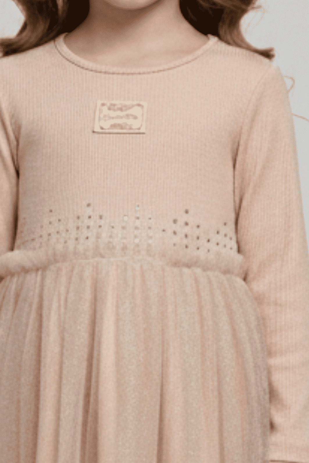 | Descrição | Vestido infantil com modelagem evasê, parte superior em malha canelada de manga longa e gola redonda. Possui detalhe aplicado no peito e acabamento com microaplicações na linha da cintura. Saia com sobreposição de tule levemente cintilante, trazendo volume e movimento à peça. Comprimento na altura do joelho, toque macio e caimento leve, indicado para ocasiões especiais e uso casual elegante. |