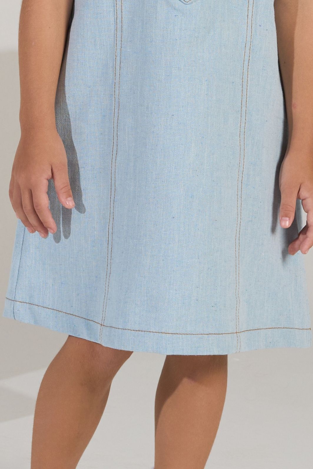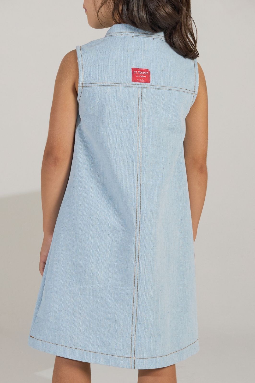 | Descrição | Vestido infantil feminino confeccionado em tecido leve tipo jeans. Modelagem reta e confortável, sem mangas, com gola tradicional e abertura frontal parcial com botões. Comprimento curto, proporcionando praticidade e liberdade de movimentos. Ideal para uso casual em dias quentes. |