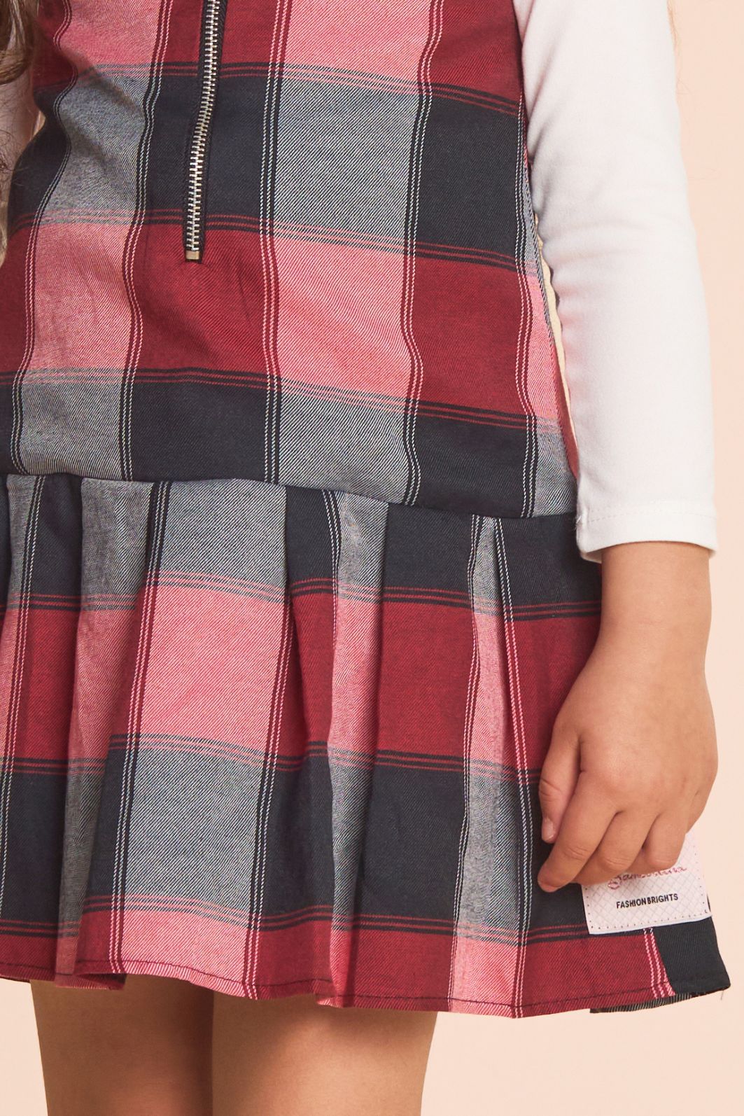 | Descrição | Vestido infantil em sarja com estampa xadrez. Modelo sem mangas, e fechamento frontal por zíper metálico. Possui recorte na cintura e saia com pregas, proporcionando leve volume. Peça estruturada, ideal para composições de meia-estação. |