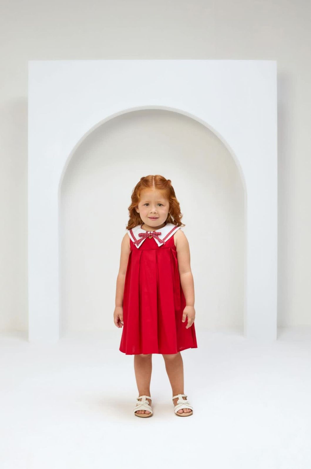 | Descrição | Vestido infantil confeccionado em tecido leve, com modelagem solta e pregas frontais que garantem conforto e movimento. Apresenta gola branca estilo marinheiro com acabamento em fita xadrez vermelho e branco, adornada por laço central com pingente dourado. Ideal para ocasiões casuais ou festivas, combina charme clássico e delicadeza infantil. |