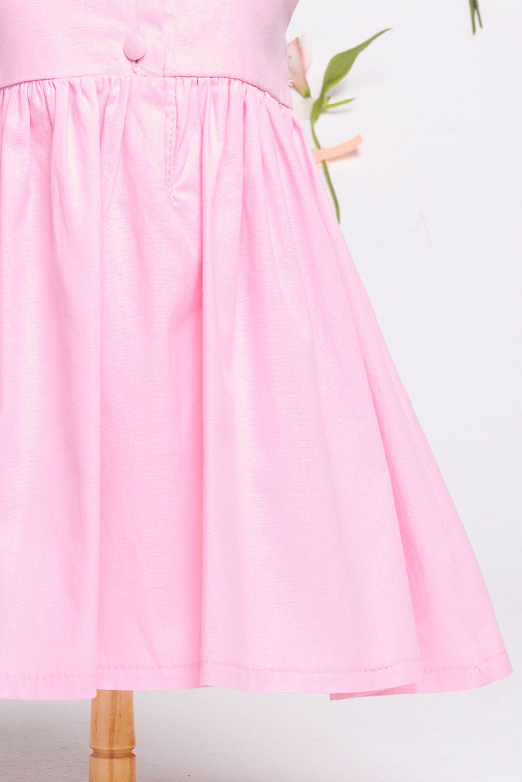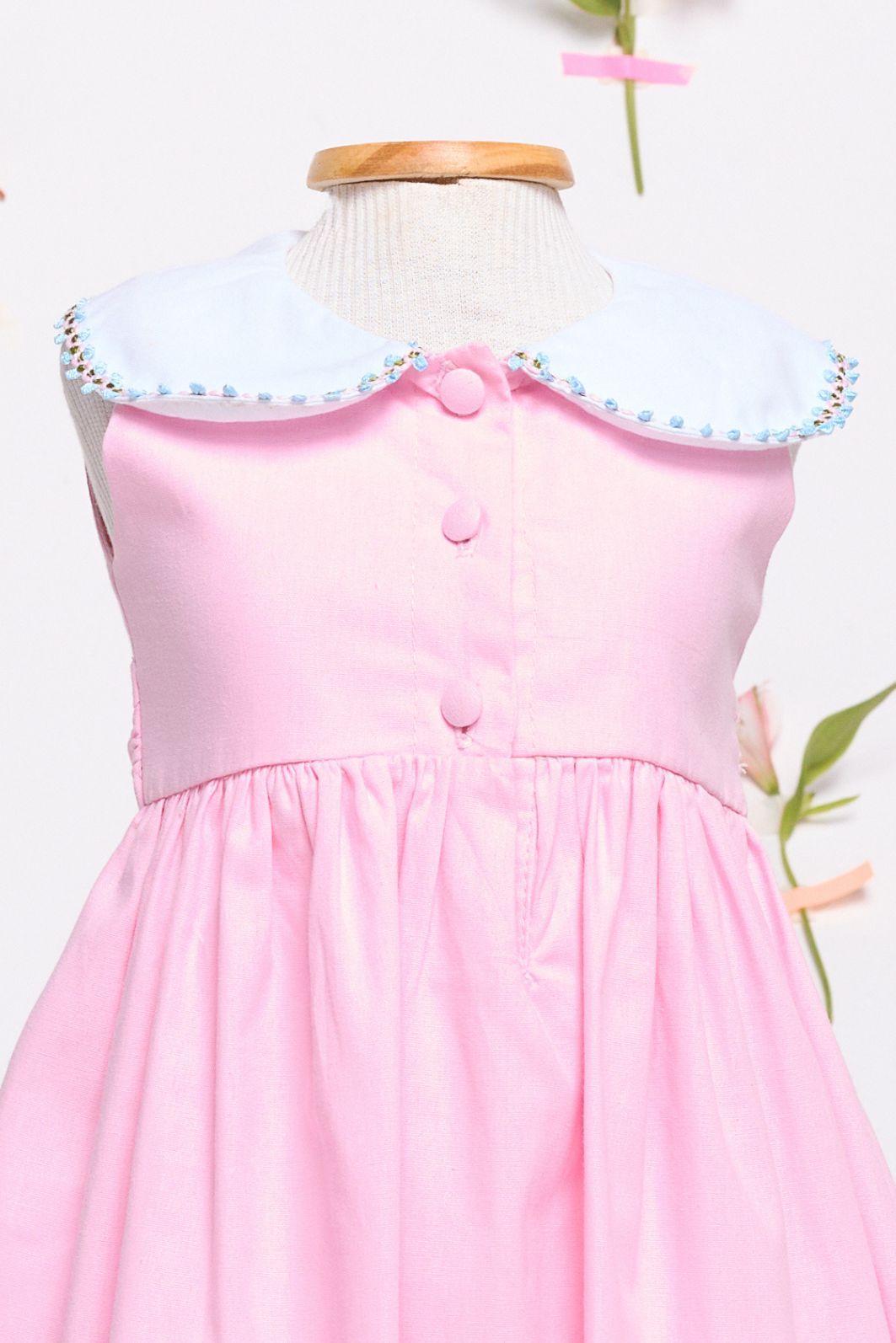 | Descrição | Vestido infantil confeccionado em tecido liso, com gola estilo Peter Pan contrastante e detalhe bordado. Possui fechamento frontal por botões, cintura marcada com recorte franzido e saia rodada de comprimento curto, oferecendo visual clássico e delicado. |