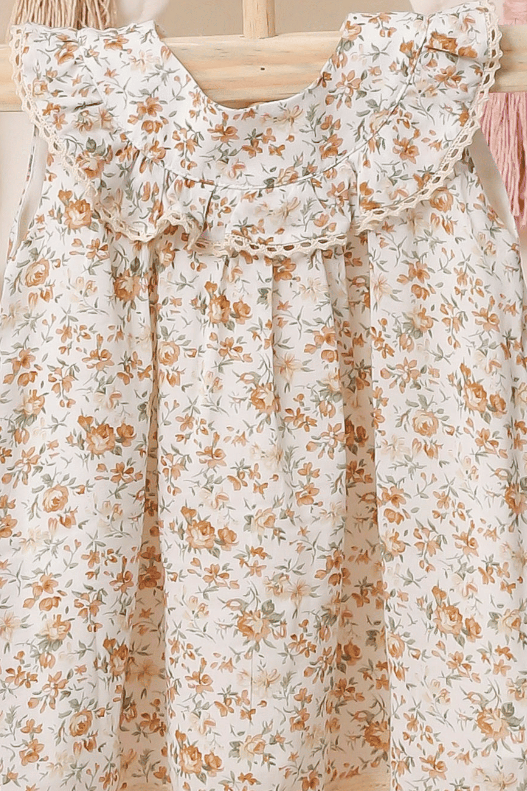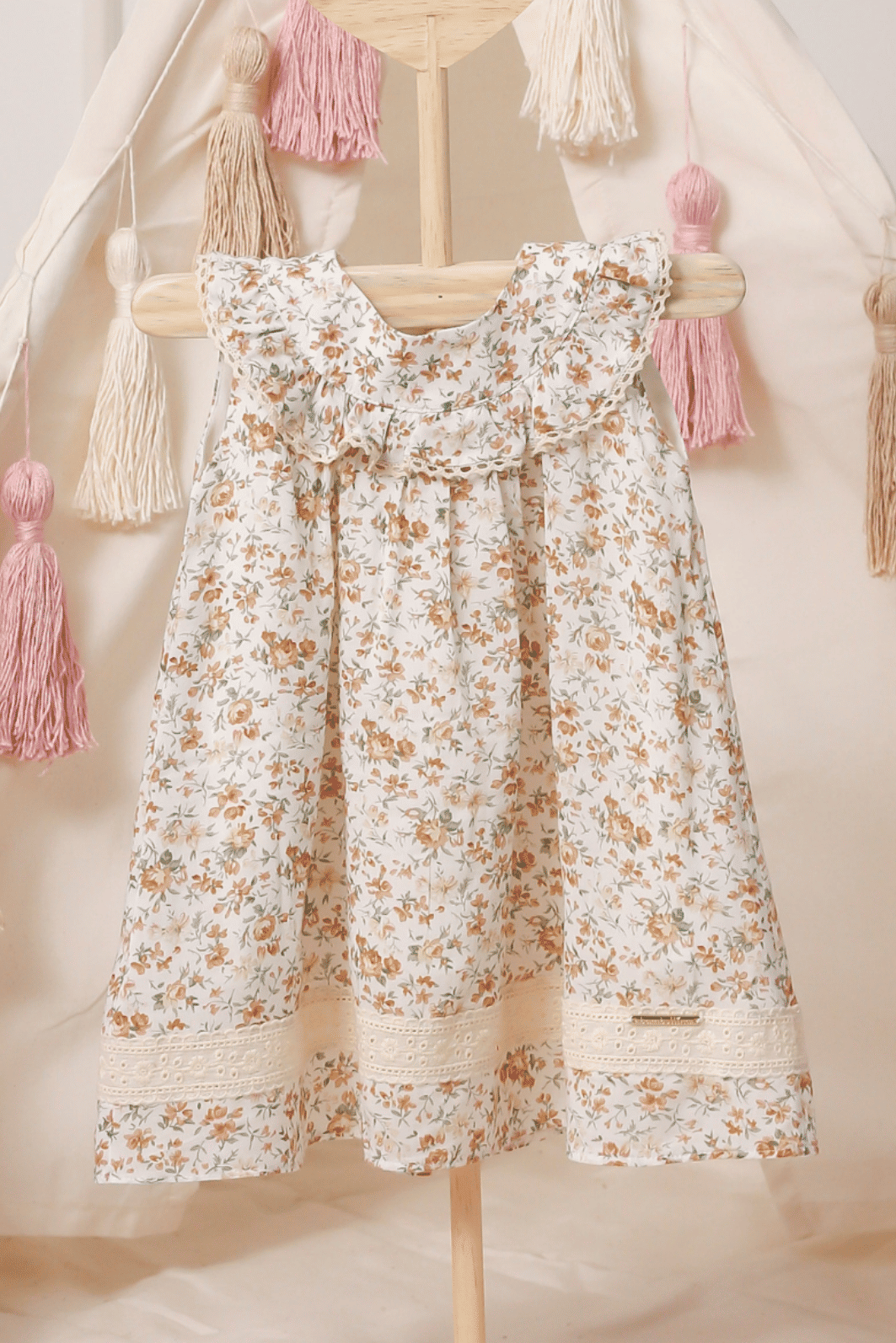 Descrição | Vestido de tricoline estampado sem mangas. Possui gola embutida ao decote, renda aplicada na gola e cavas embutidas ao forro. Conta com renda aplicada próximo à barra, com placa personalizada da marca sobreposta. O modelo é finalizado com abertura nas costas e fechamento por elástico roliço e botão. |