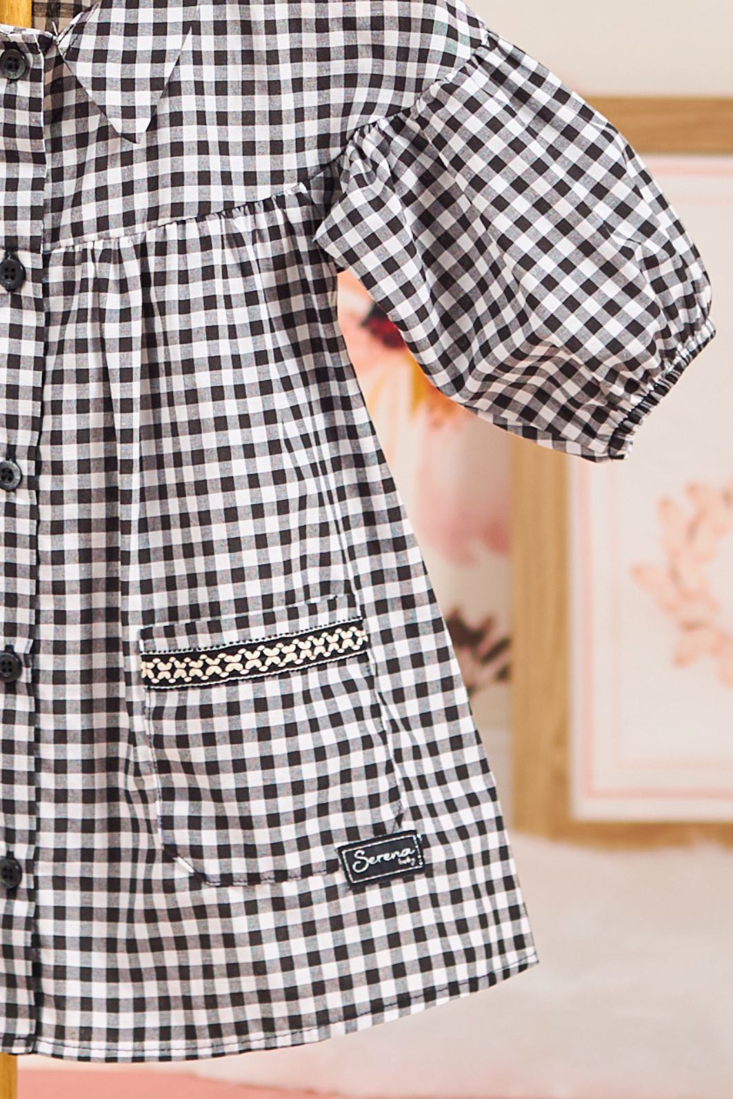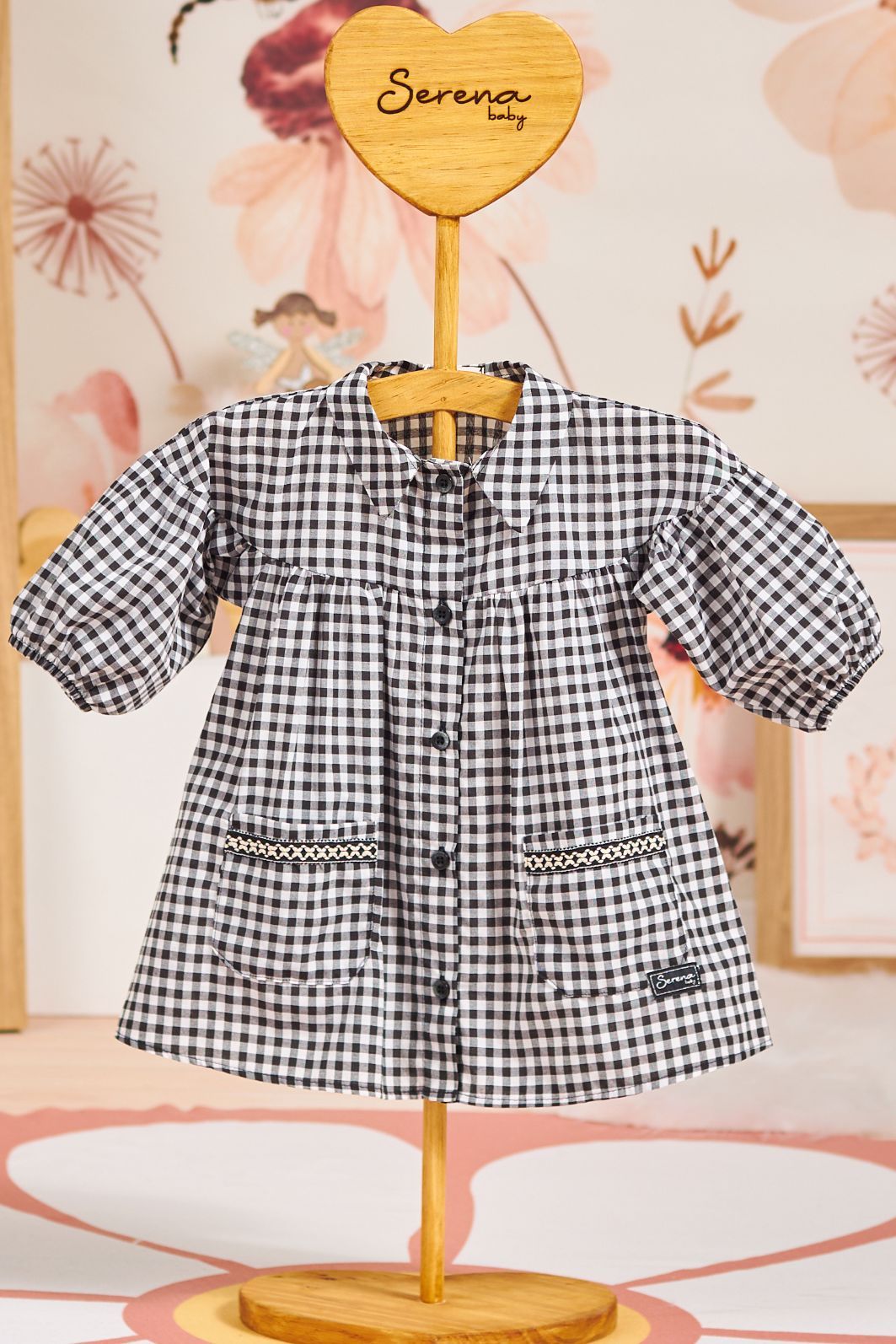 Descrição | Este clássico e charmoso Vestido Infantil Xadrez Vichy (Gingham) é perfeito para um visual casual chic e atemporal. Confeccionado em tecido leve com a icônica estampa preto e branco, ele possui uma modelagem soltinha estilo camisa com botões frontais e uma elegante gola colarinho. Os detalhes de manga bufante (balão) e os práticos bolsos frontais com detalhe de uma fita dão um toque final romântico e moderno. É a peça ideal para passeios, fotos ou um look Mini Blogueirinha cheio de estilo. |
