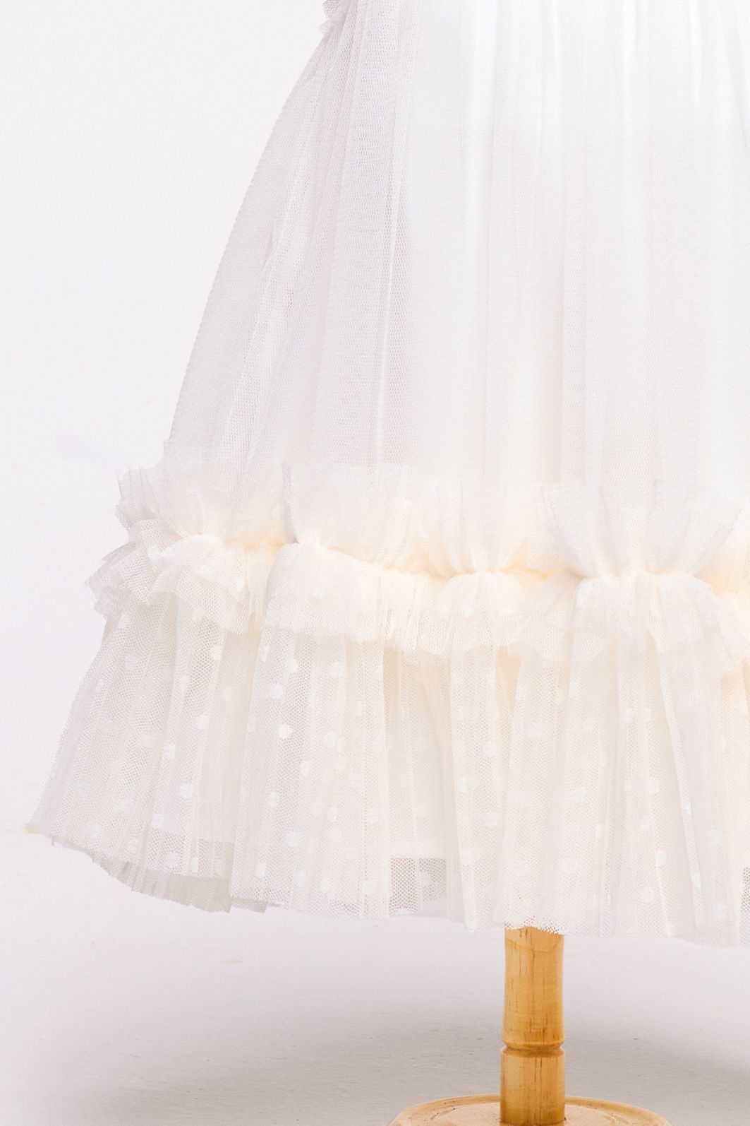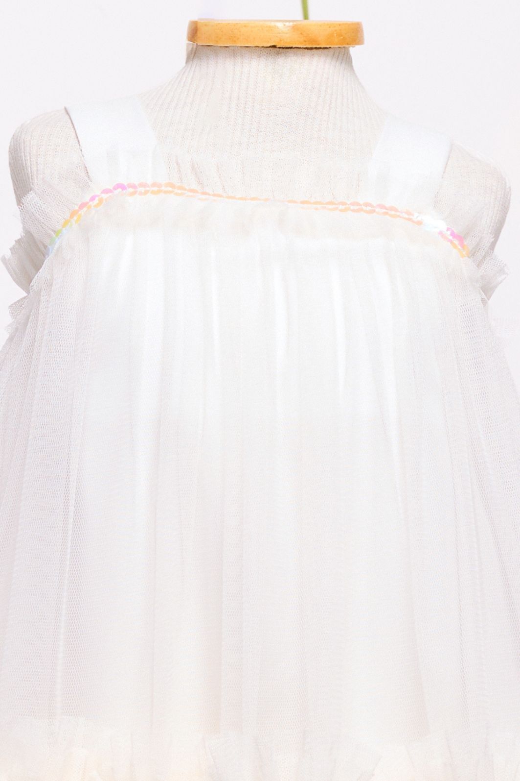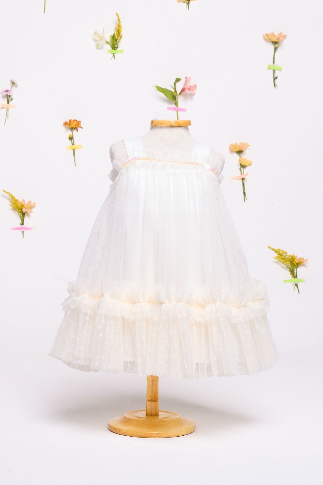 | Descrição | Vestido infantil feminino confeccionado em tule leve na cor branca, com modelagem rodada e caimento fluido. Possui alças com acabamento delicado, corpo com detalhe em tule poá e saia em camadas com babados, proporcionando visual romântico, ideal para festas e ocasiões especiais. |