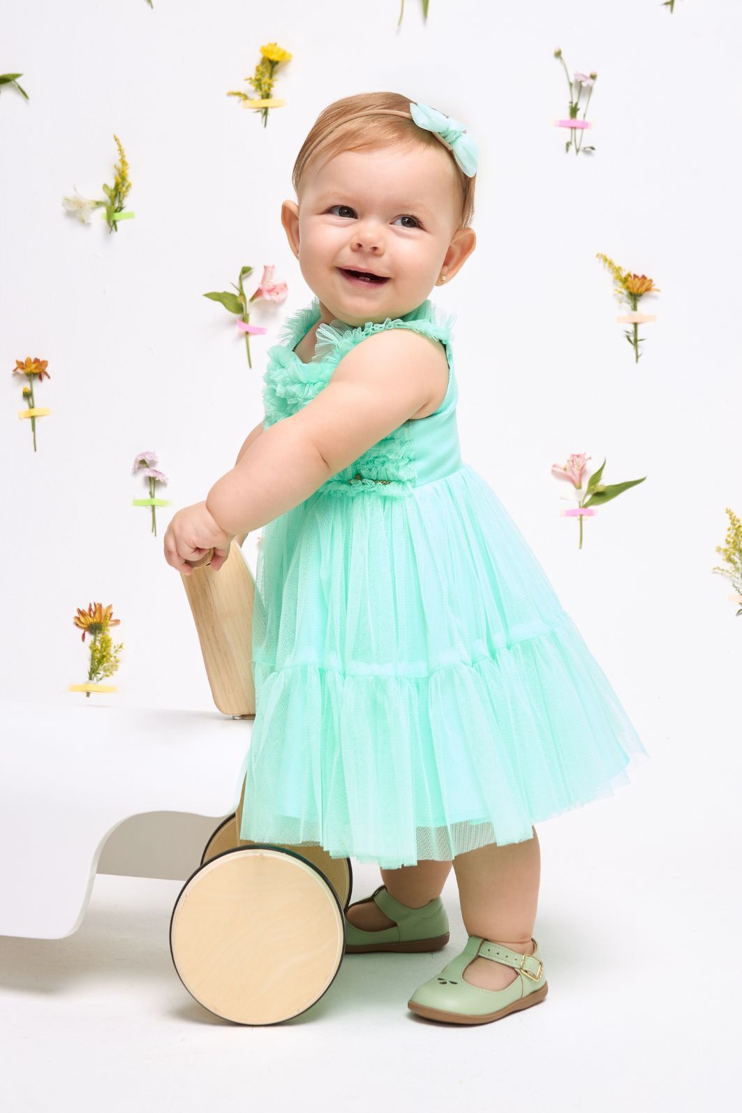 | Descrição | Vestido infantil confeccionado em tule verde menta, com parte superior em babados delicados e alcinhas finas com detalhes franzidos. Saia ampla e fluida com camadas leves que garantem movimento e conforto. Possui forro macio para melhor caimento e toque suave na pele. Ideal para ocasiões especiais e dias de verão, com visual romântico e encantador. |