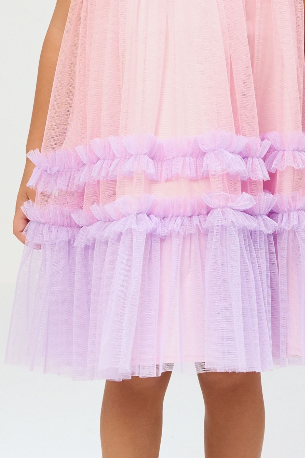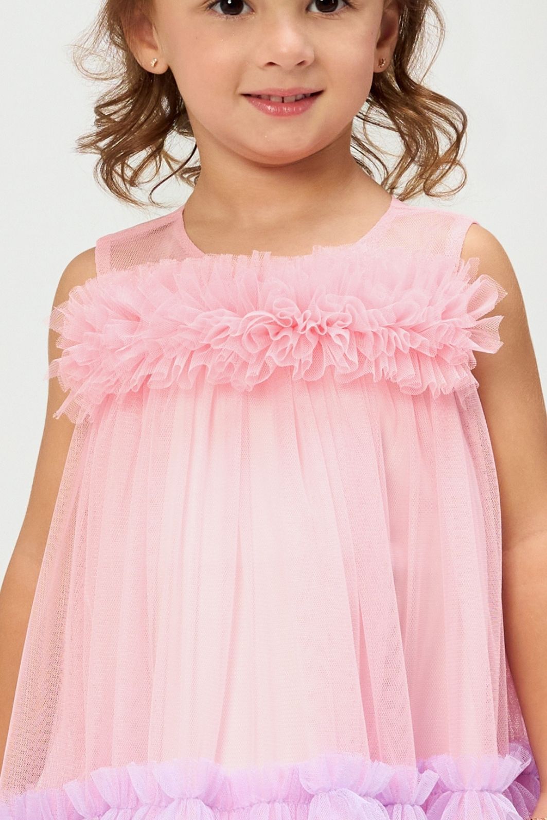| Descrição | Vestido infantil confeccionado em tule leve, com camadas sobrepostas e babados decorativos. Modelagem evasê/rodada, sem mangas, decote redondo, comprimento na altura do joelho. Apresenta efeito degradê em tons suaves, proporcionando visual delicado e volumoso. Indicado para festas e ocasiões especiais. |