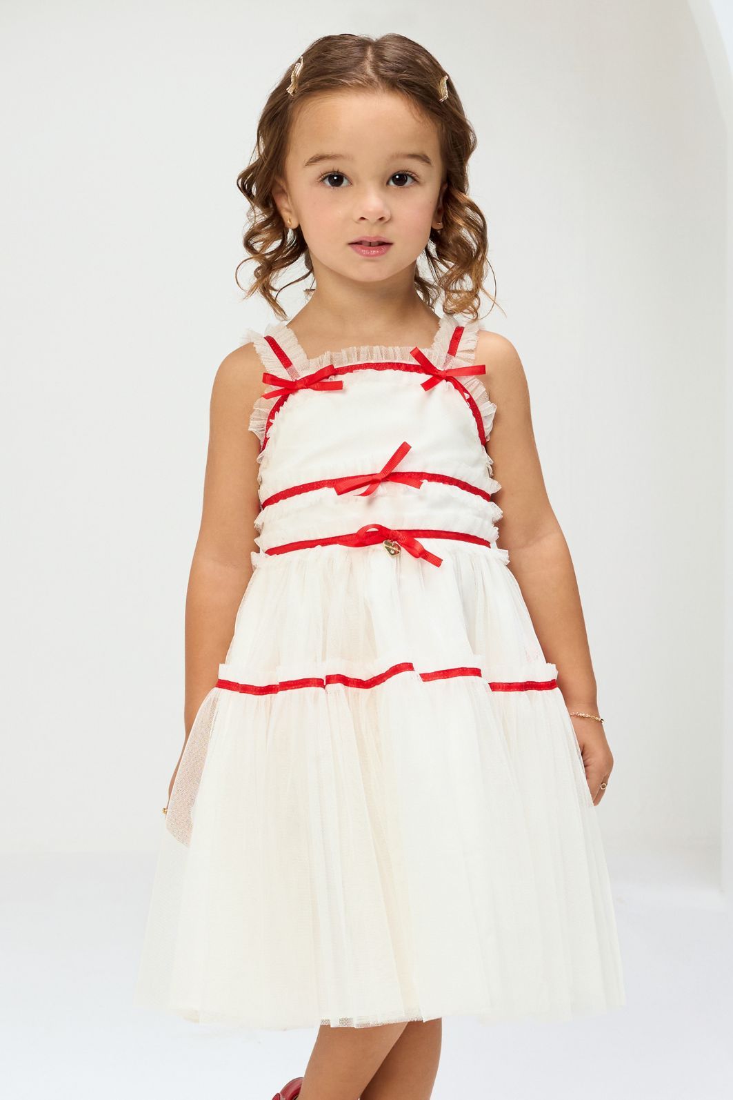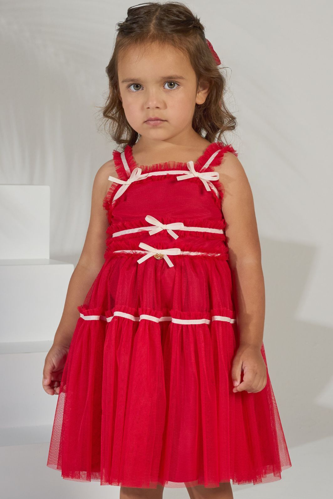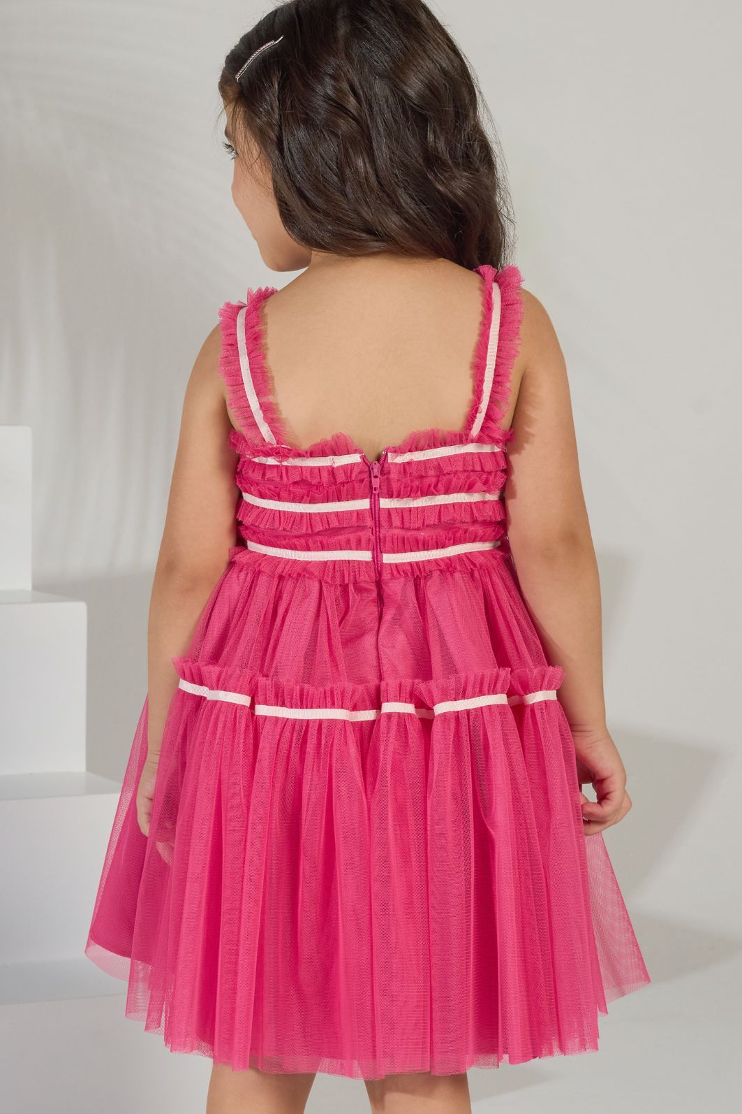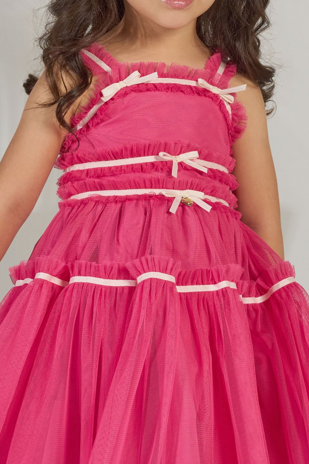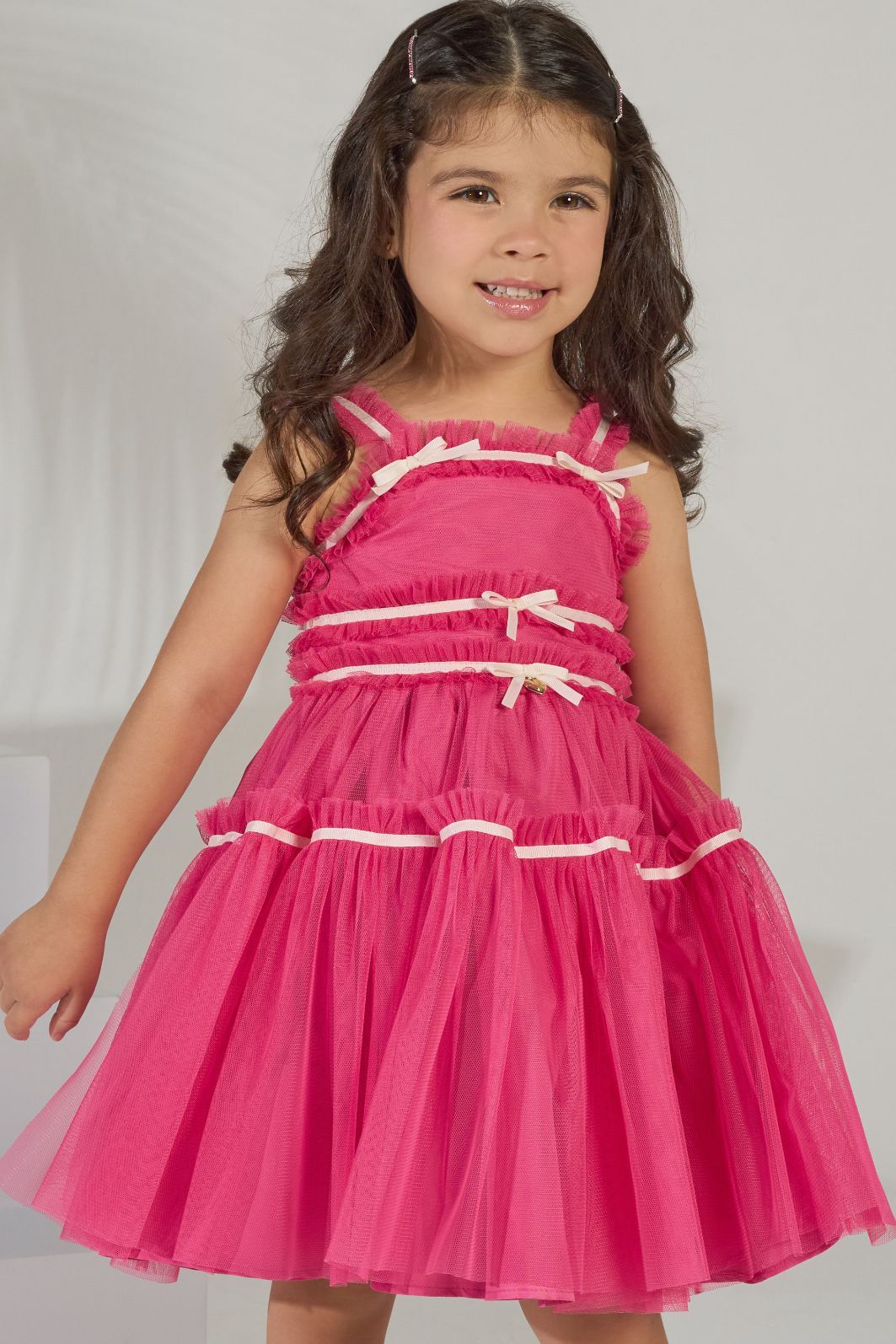 | Descrição | Este vestido infantil de festa vibrante em um tom de pink intenso. O modelo apresenta uma saia volumosa em camadas de tule, que confere leveza e movimento. O corpinho é detalhado com franzidos e laços finos, que adicionam um toque delicado. As alças também são decoradas com pequenos laços, completando o visual de festa encantador. |