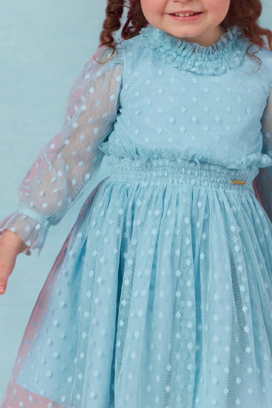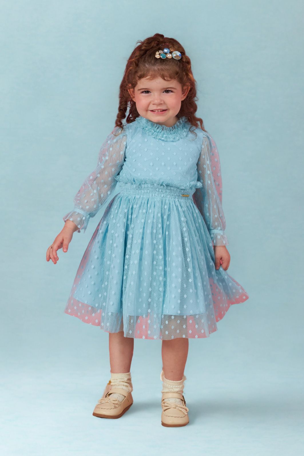 Descrição | A peça contém um tule leve e macio com um charmoso padrão poá. Um tom suave de azul bebê que é elegante e atemporal. Apresenta uma gola alta franzida e mangas longas bufantes feitas em tule, conferindo um visual sofisticado e de conto de fadas. Possui elástico na cintura para um ajuste confortável e perfeito, permitindo liberdade de movimento para a criança brincar e se divertir. |