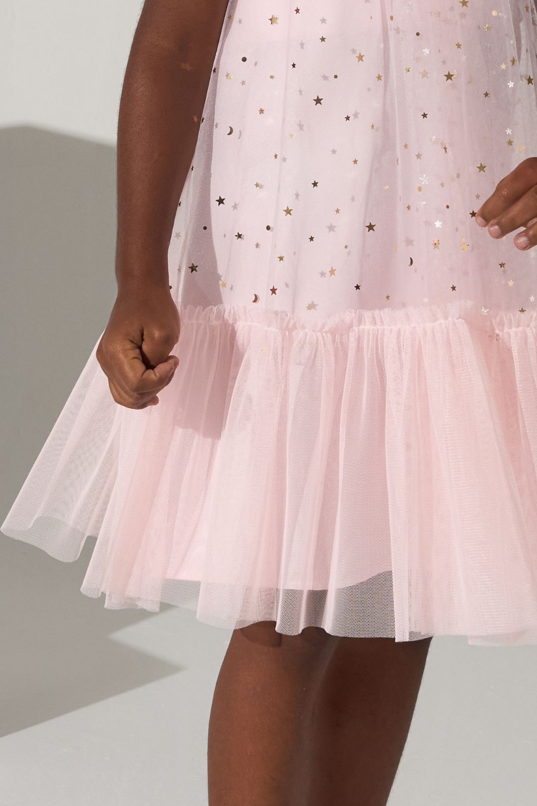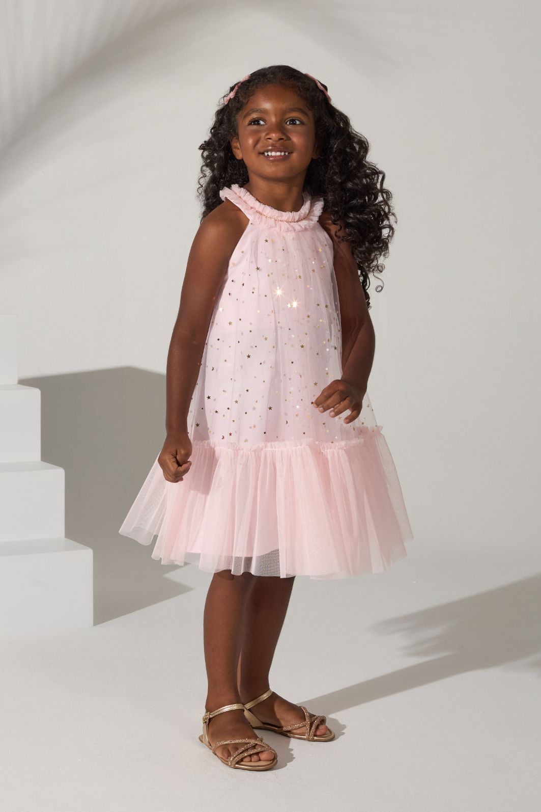 | Descrição | Vestido infantil confeccionado em tule rosa com aplicações de brilho em formato de estrelas. Modelo sem mangas, com gola alta franzida e fechamento posterior por botão. Possui forro interno e babado em tule na barra, garantindo leveza, conforto e efeito rodado. Ideal para festas e ocasiões especiais. |