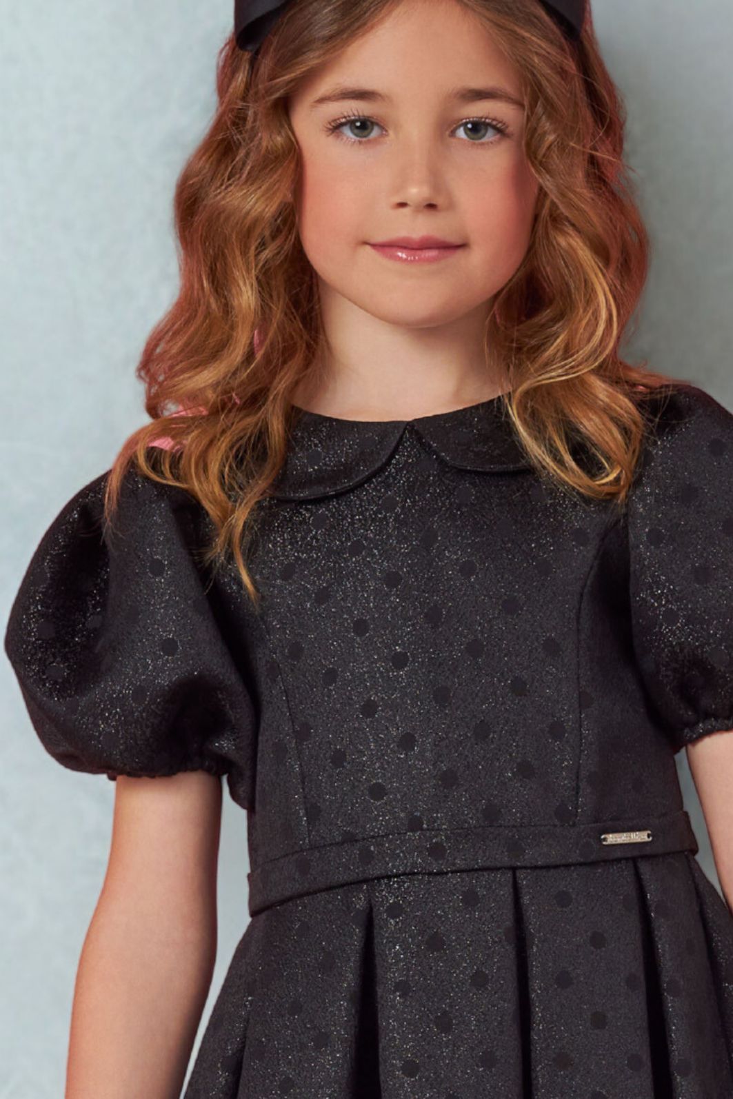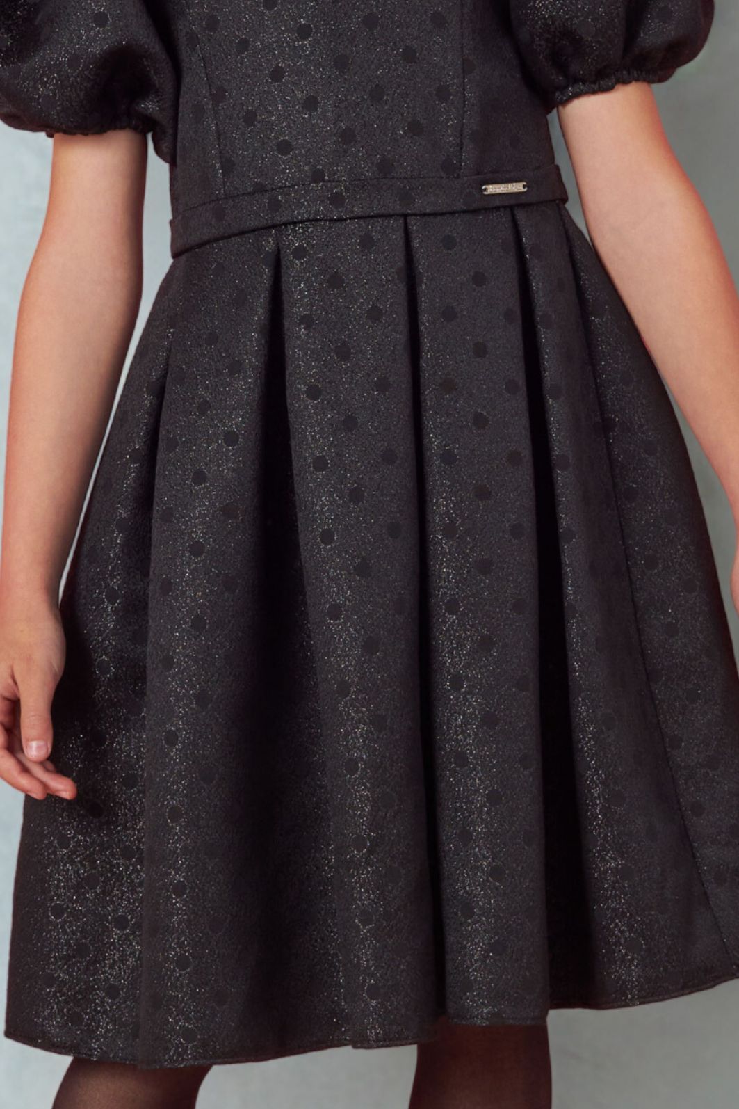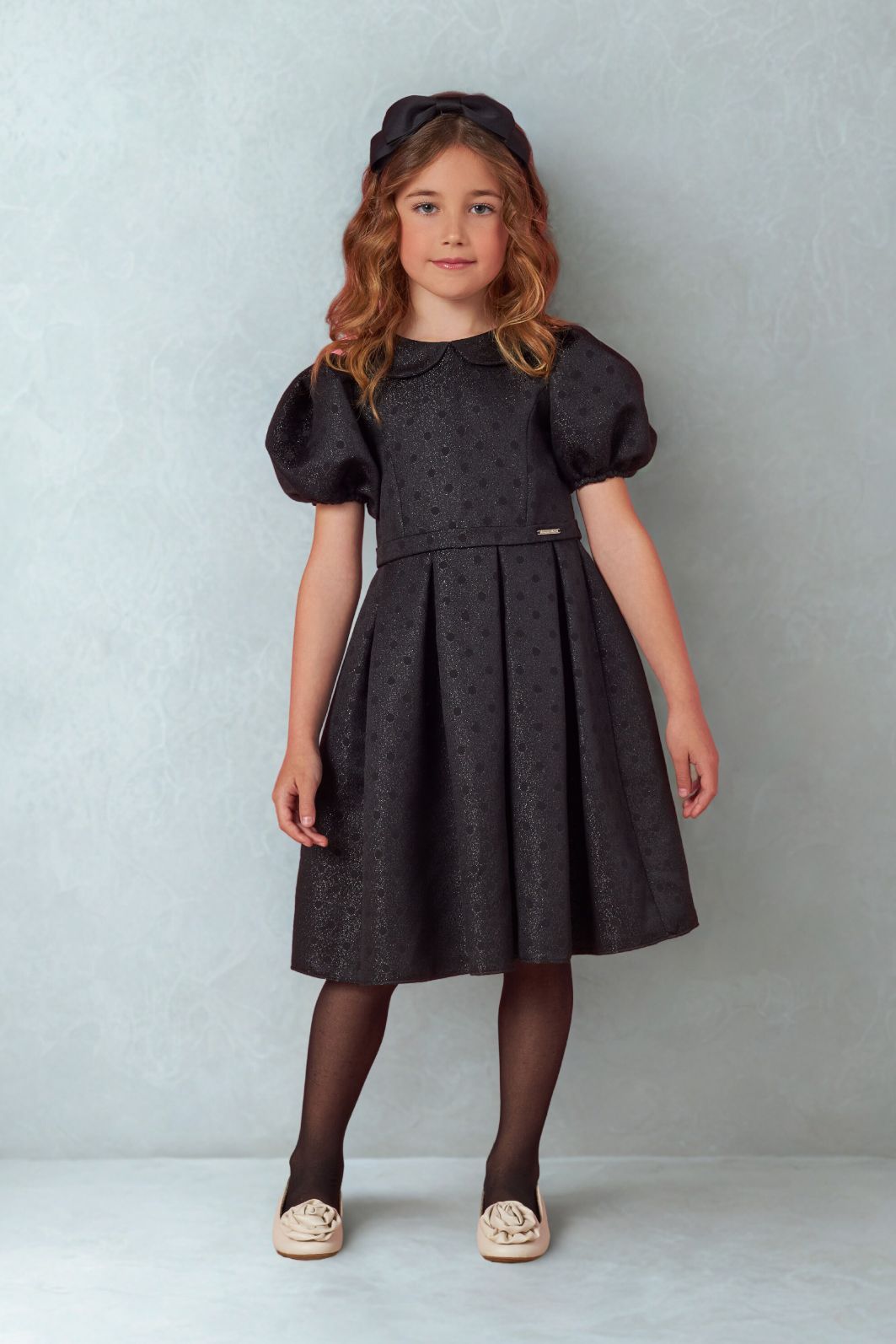 | Descrição | Vestido infantil feminino confeccionado em tecido texturizado com brilho sutil e poá, modelagem rodada e pregas frontais. Possui mangas bufantes, gola peter pan e cinto fino aplicado na cintura. Acabamento refinado, ideal para ocasiões especiais e eventos formais. |