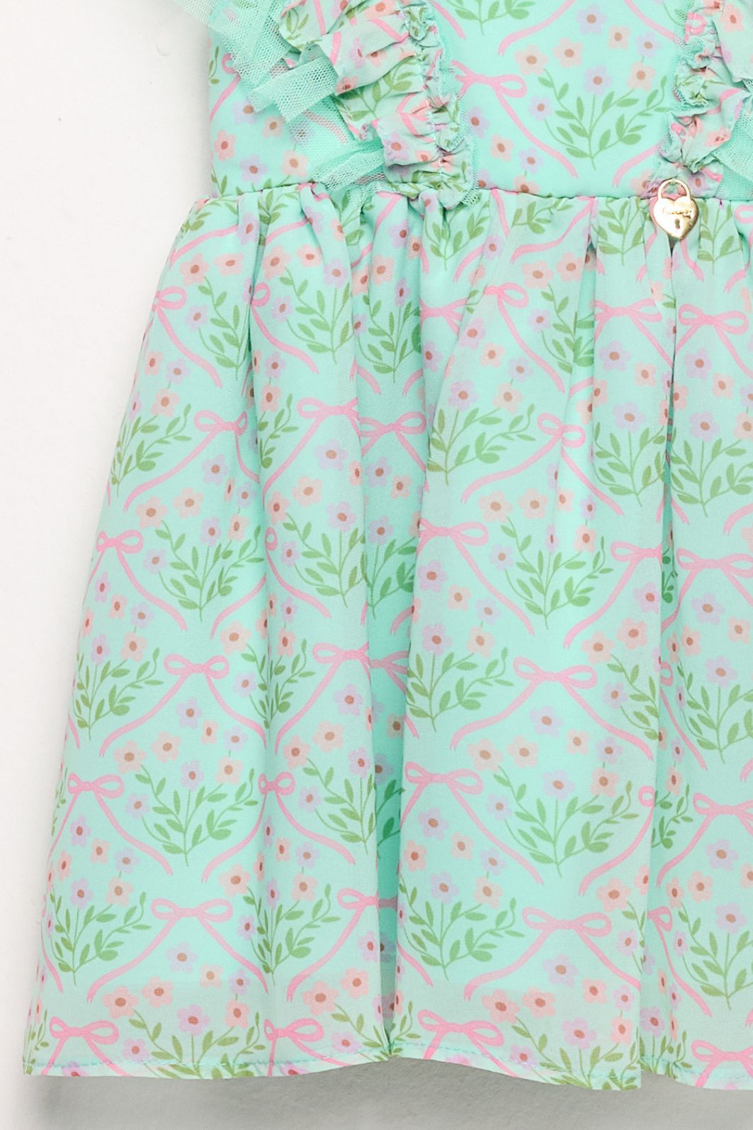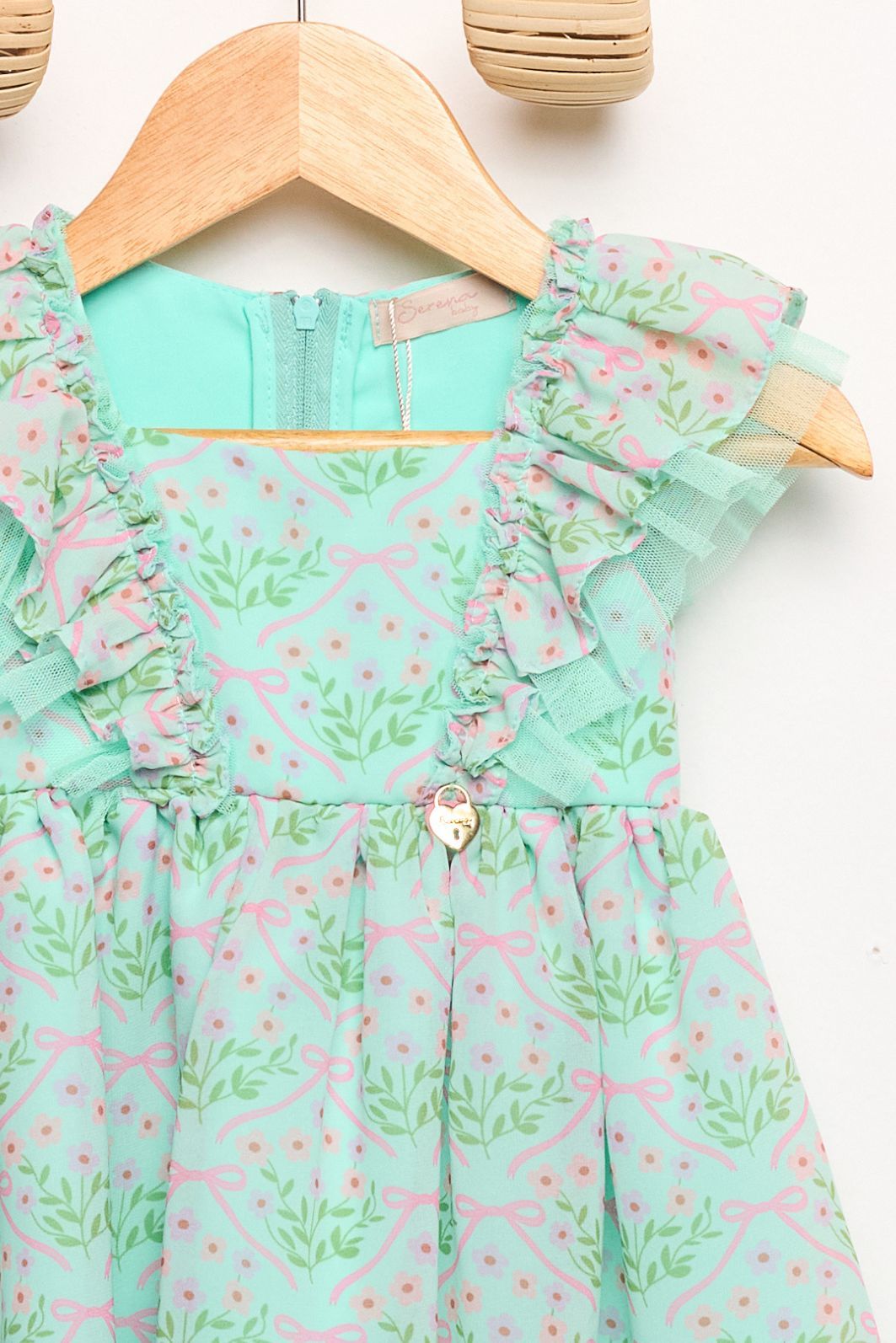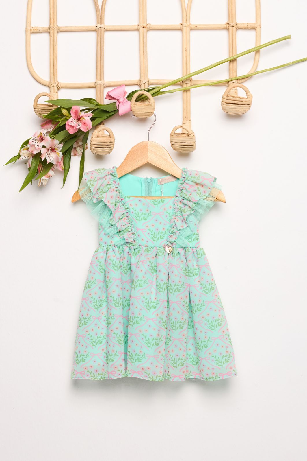 | Descrição | Vestido infantil confeccionado em tecido leve, com estampa floral delicada. Possui modelagem evasê com saia rodada, alças com babados e decote reto. Conta com detalhe decorativo frontal e acabamento confortável, ideal para uso diário e ocasiões casuais. |