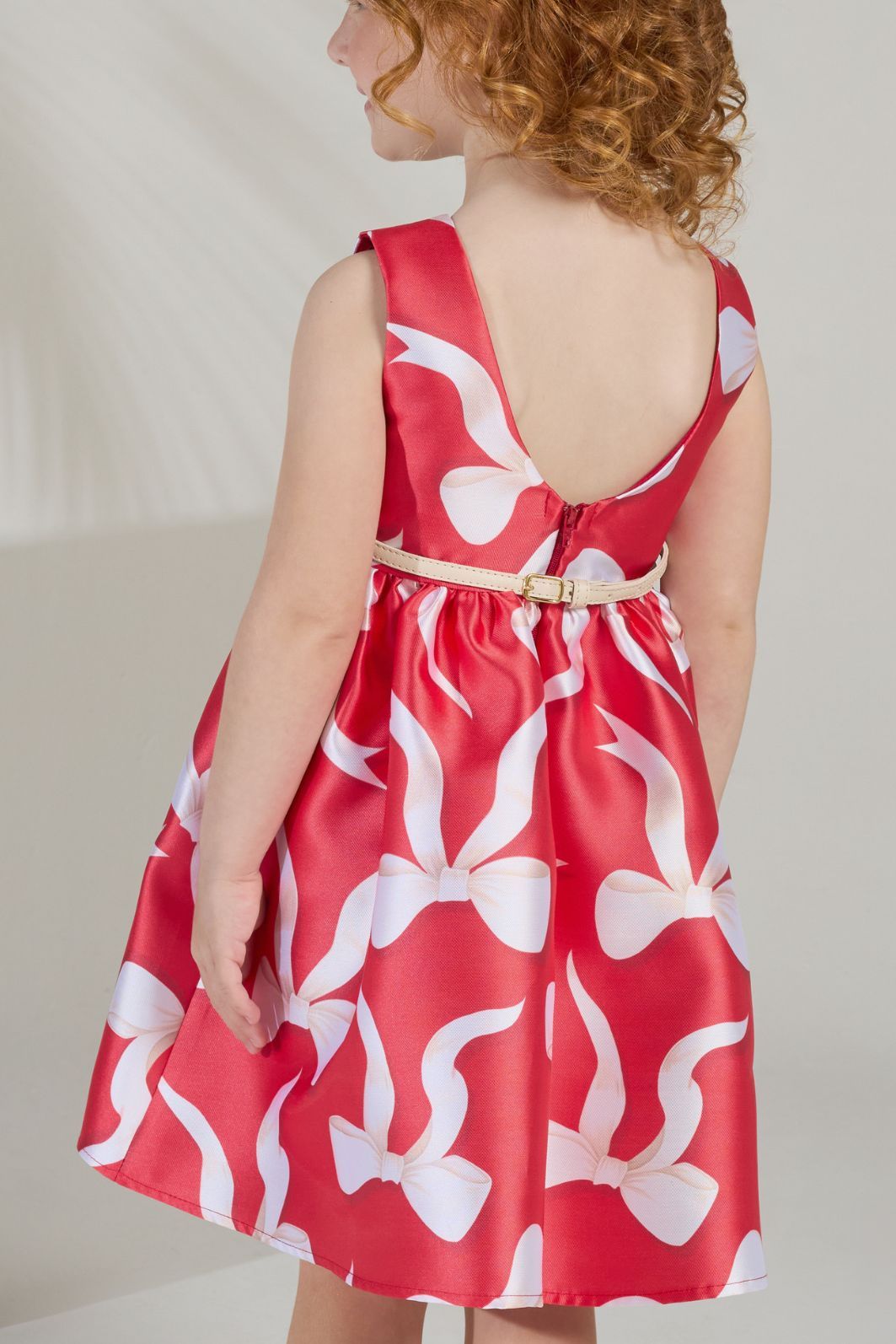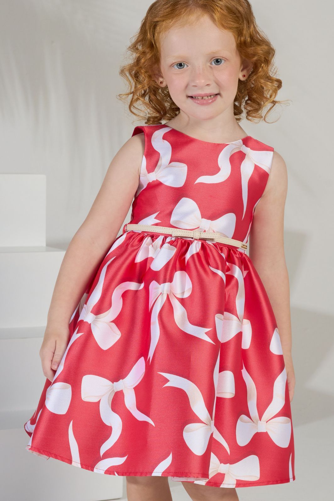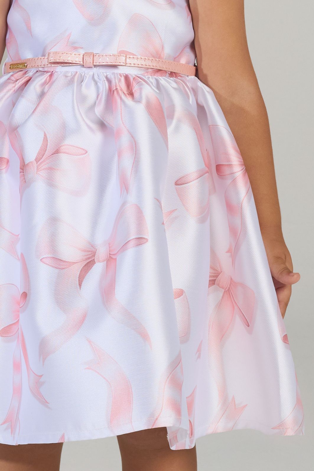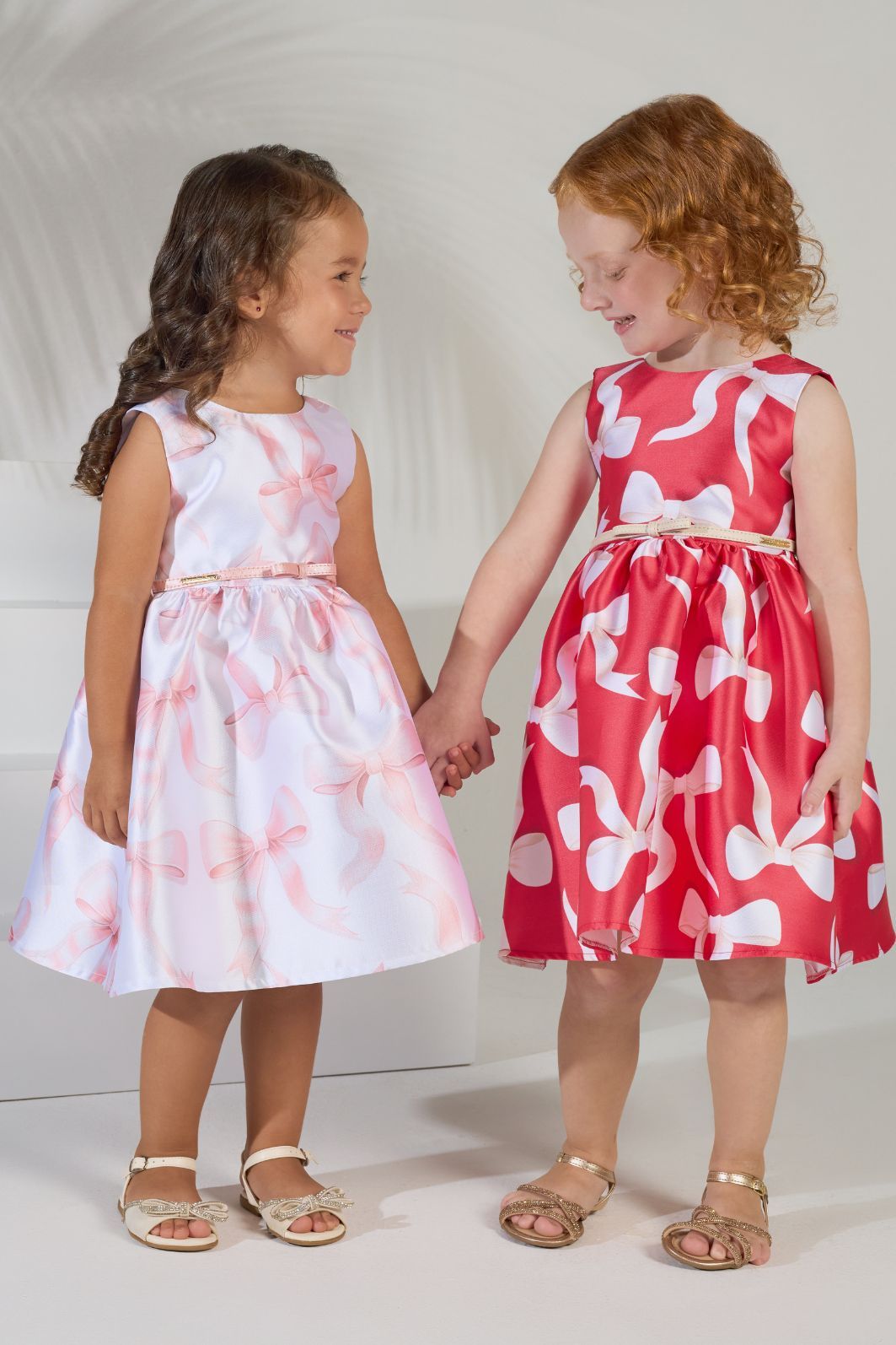| Descrição | Vestido infantil feminino confeccionado em tecido encorpado com leve brilho e estampa de laços em tons de rosa. Possui modelagem evasê, sem mangas, cintura marcada com delicado cinto e saia rodada que garante ótimo caimento. Ideal para ocasiões especiais, combina conforto e elegância em um visual encantador. |