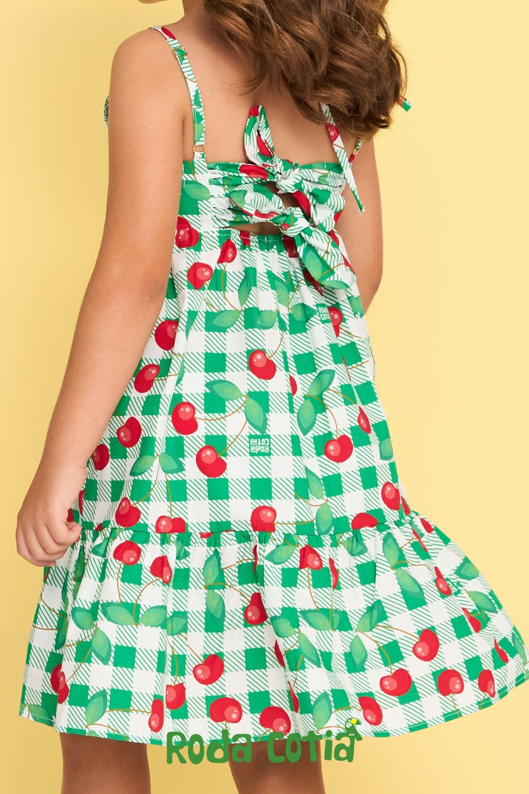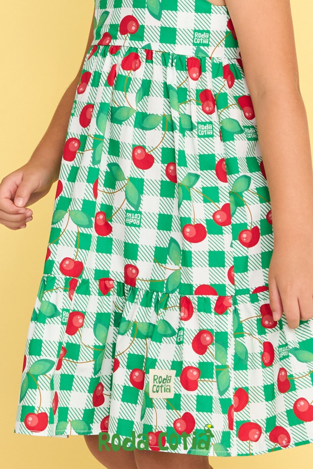 | Descrição | Vestido infantil em tecido leve com estampa xadrez verde e de cerejas. Modelo de alças finas, busto com recorte franzido e saia rodada em camadas para maior volume. Possui caimento confortável e etiqueta aplicada na barra. Ideal para dias quentes e uso casual. |