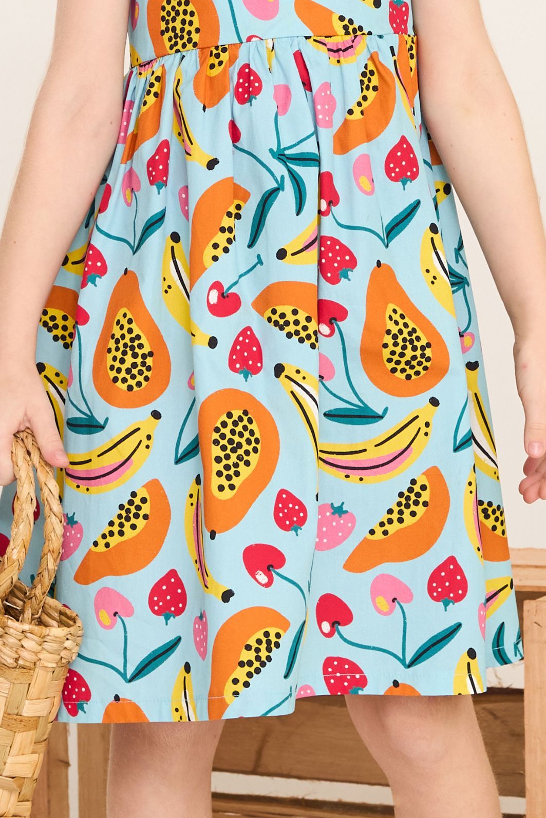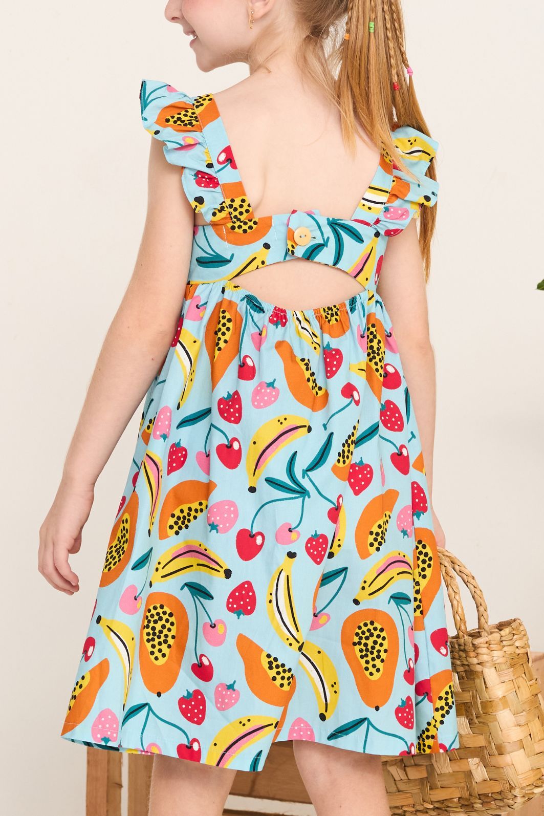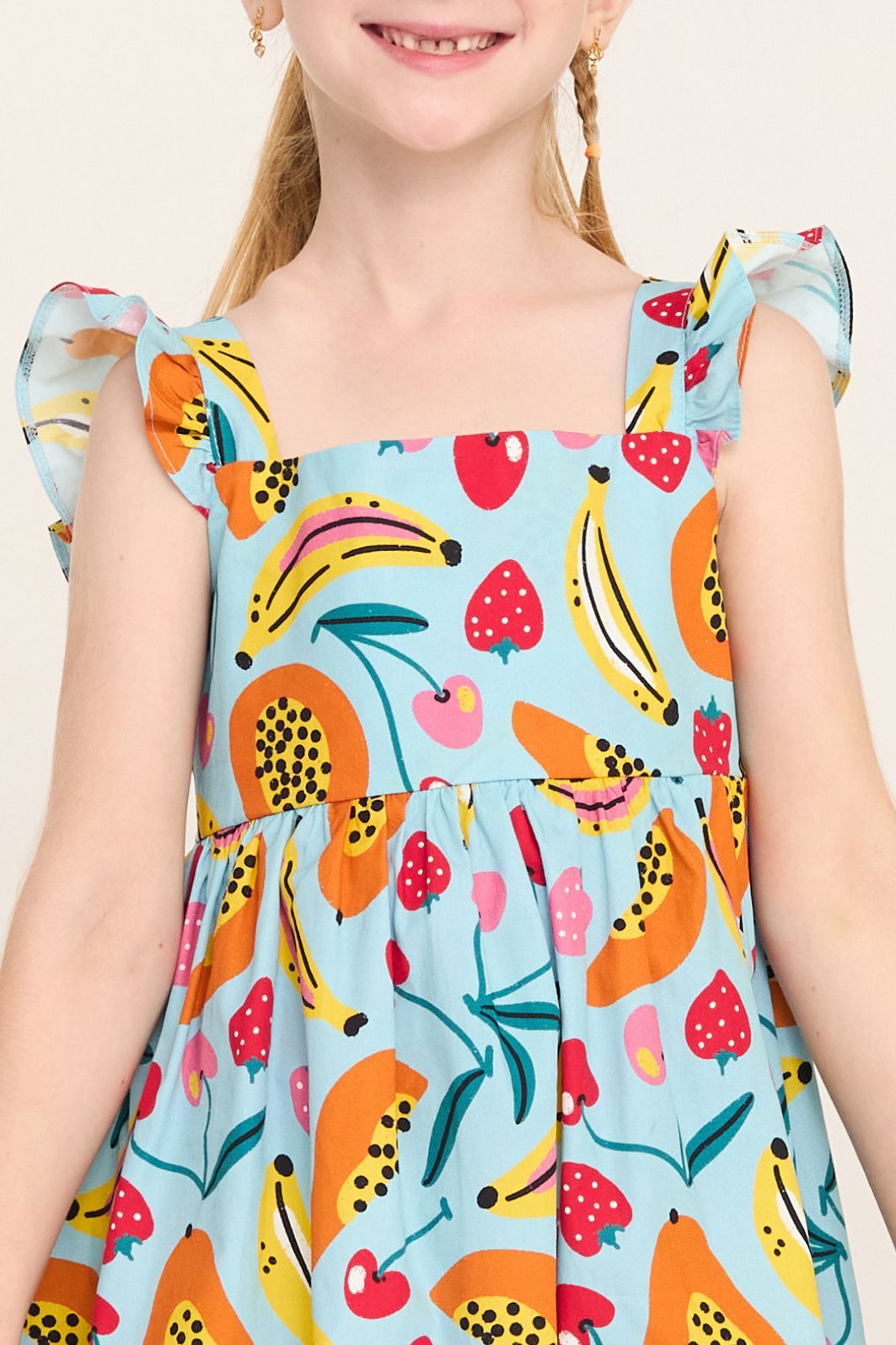 | Descrição | Vestido infantil feminino confeccionado em tecido leve, com estampa colorida de frutas em padrão tropical. Possui modelagem soltinha, decote reto, alças largas com babado e abertura nas costas que facilita o vestir e proporciona melhor ajuste. Peça confortável e fresca, ideal para o uso diário e dias de verão. |