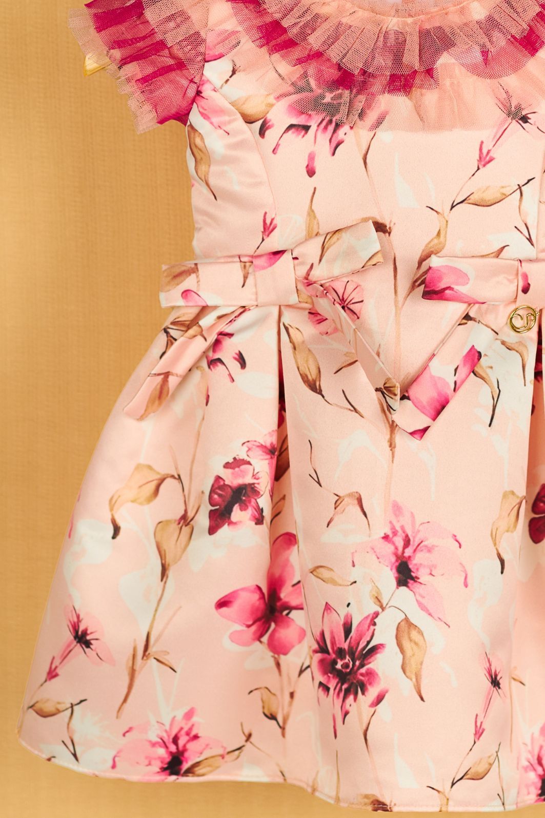 | Descrição | Vestido infantil confeccionado em tecido leve com estampa floral em tons rosados. Possui gola e mangas com detalhe em tule, laços aplicados na cintura e modelagem evasê com pregas que garantem volume e movimento. Fechamento posterior com zíper, acabamento delicado e toque macio, ideal para ocasiões especiais. |